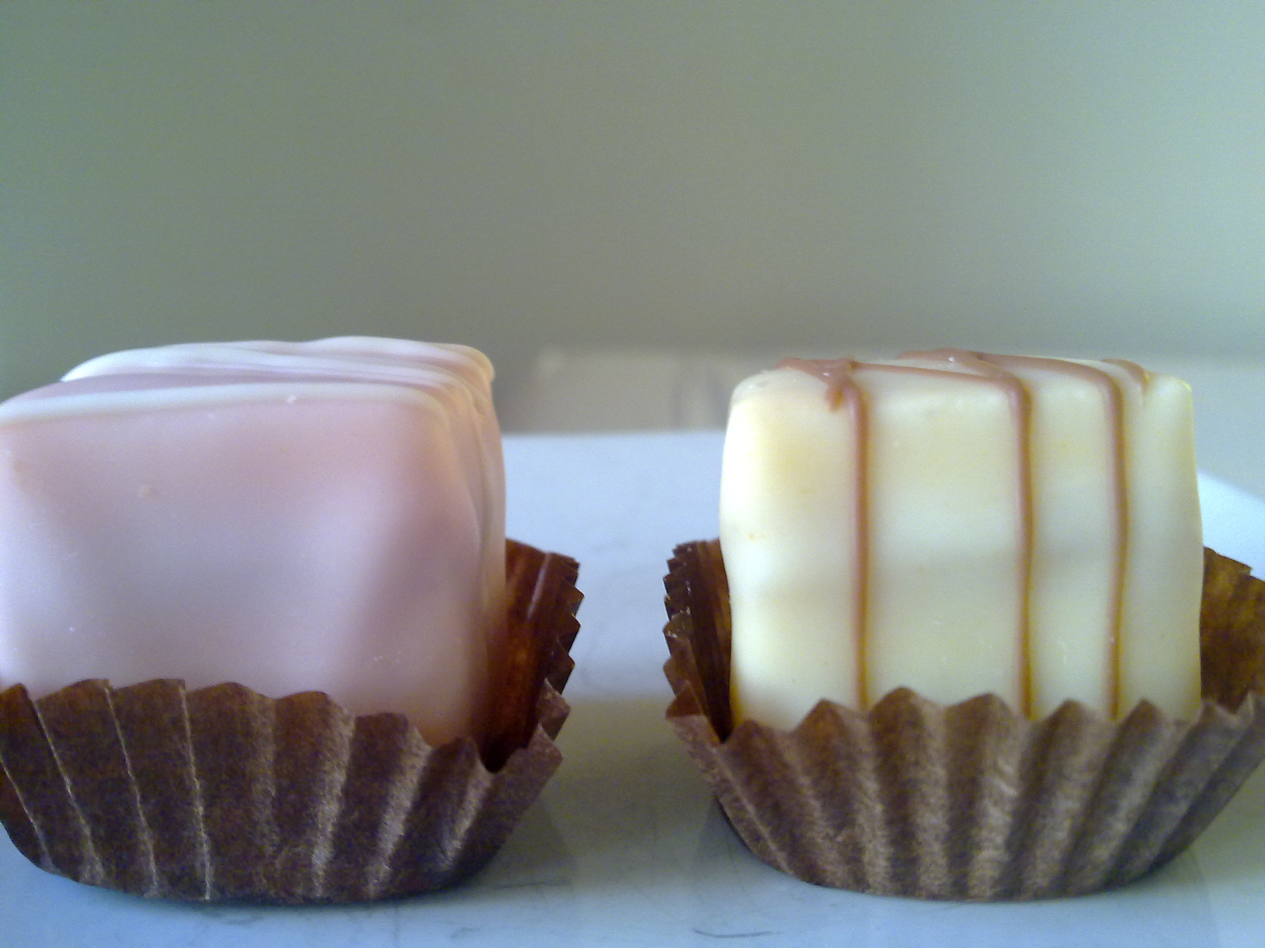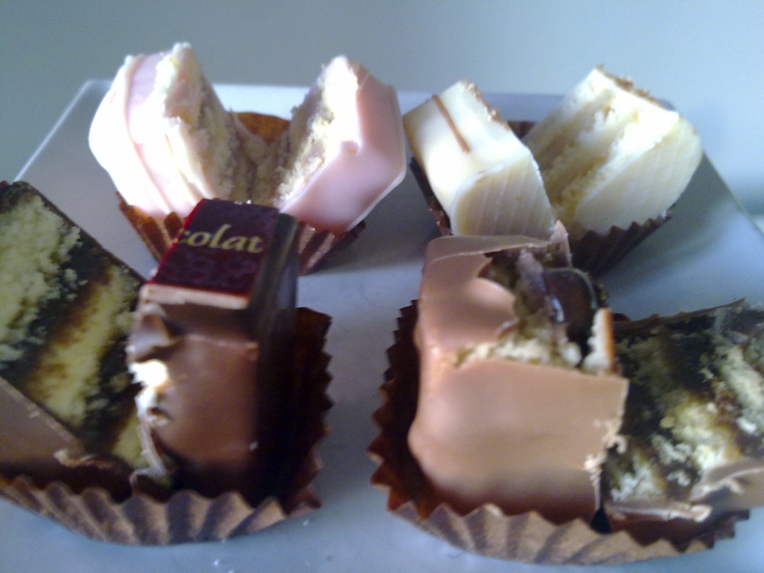 Kuvittelin konvehdin olevan aina täytesuklaata ja näiden sisältä paljastuikin yllätys: ne olivat kuin pieniä leivoksia, kolme kerrosta kakkua ja kaksi eräänlaista kreemiä tai praliinia. Konvehti onkin saksankielisissä maissa laajempi käsite ja koskee täytesuklaiden lisäksi muita pieniä konditoriatuotteita, myös pikkuleipiä. Wiener Konfekt –pussukasta saa pulittaa 6,10 CHF eli euroissa noin 1,40 per herkku .
