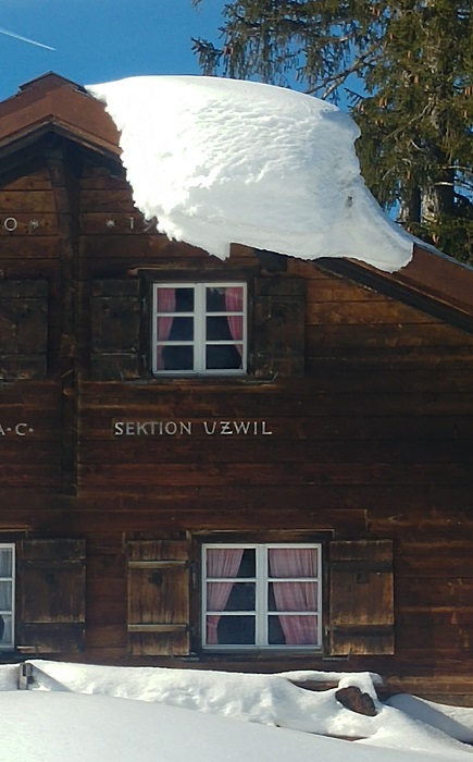 Nousun jälkeen ylätasangolla Thurtalerstoffelilla reilun puolentoista kilometrin korkeudessa vajan edustalla on täyttä. Ainoalla penkillä istuu hymyilevää porukkaa paisteessa. Ruskeat naamat hehkuvat ja kaikki tervehtivät lähes yhteen ääneen. Joku nousee ylös tehdäkseen tilaa, me jatkamme kuitenkin eteenpäin.