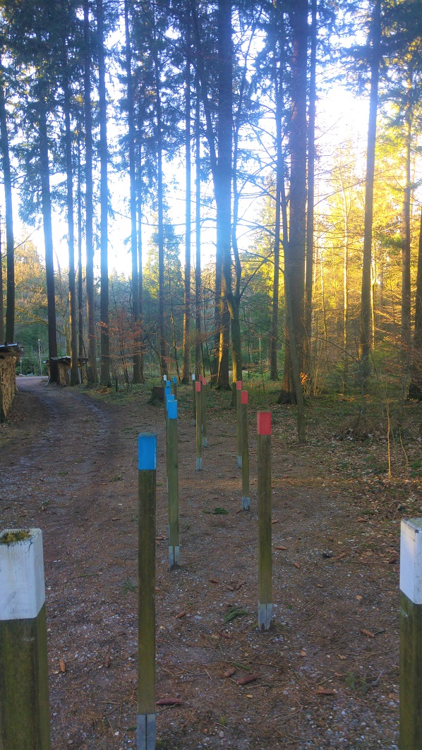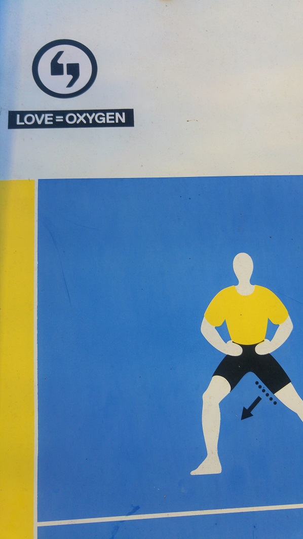 Viimeisellä treenipisteellä on tietenkin slalomia. Ensin ihan normaalityyliin, sitten jokaisen palkin ympärikierto juosten. Vauhti hidastuu, metsä pyörii silmissä. Huimaa. Venyttelytaululla luen viestin Love=Oxygen. Että happi on rakkautta. Tauluntekijä on varmaan juoksennellut slalom-rataa ympäri useamman kerran ja päässyt toiseen todellisuuteen, kuntoradalta joogatyyppiseen filosofiaan.