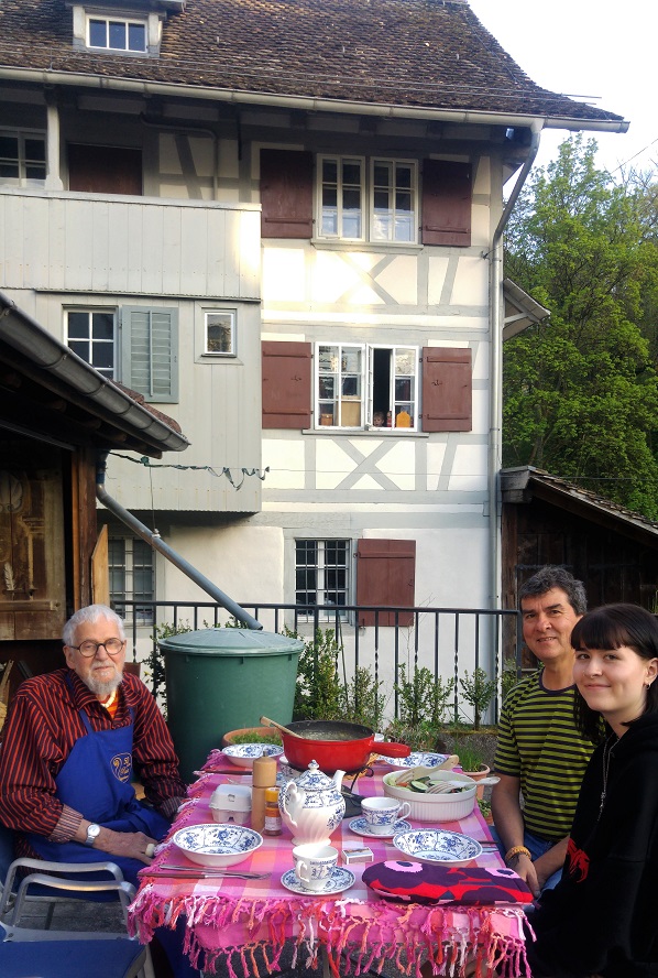 Tuskin japanilaiset eväät ovat sulaneet, kun vaihdamme eurooppalaiseen ja sveitsiläiseen. Viulunrakentajan kanssa oli sovittu fonduetreffit jo viime vuoden lopulle. Tytär oli käynyt ikuistamassa paperille ateljeesta ja kodista yksityikohtia ja projektin päättymistä piti juhlia. Tämänkin tapaamisen järjestämistä häritsivät monet menot ja juhlat. Illalla on niin lämmin, että istumme vanhan myllyn terassilla. Koira käpertyy tyttären jalkoihin, kissa pinkaisee sisälle nauttimaan rauhastaan. Naapurin poika huutelee tervehdyksensä yläkerran ikkunasta. Viulunrakentajan lampaat määkivät ja meidän pihalla ruukussa alunperin kasvanut koivu on kasvanut jo puun mittaan terassin läheisyydessä.