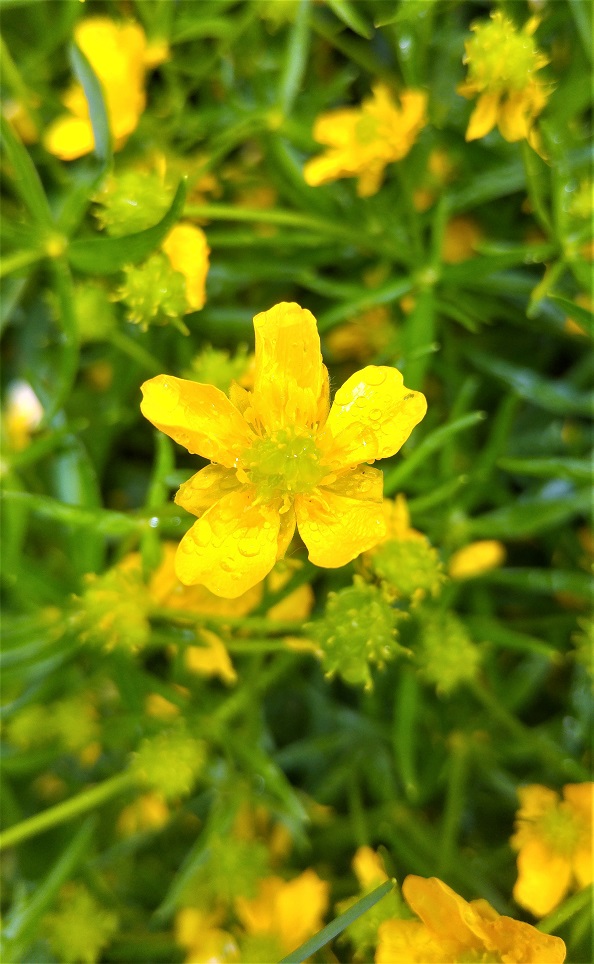 Ihoa alkaa poltella. Kämmenenkokoiset läikät ovat täynnä nokkosrokkoa. Niittykukka onkin rönslyleinikki tai joku samaa sukua – ja myrkyllinen ja hyvin vaikea saada kukkapenkistä katoamaan.