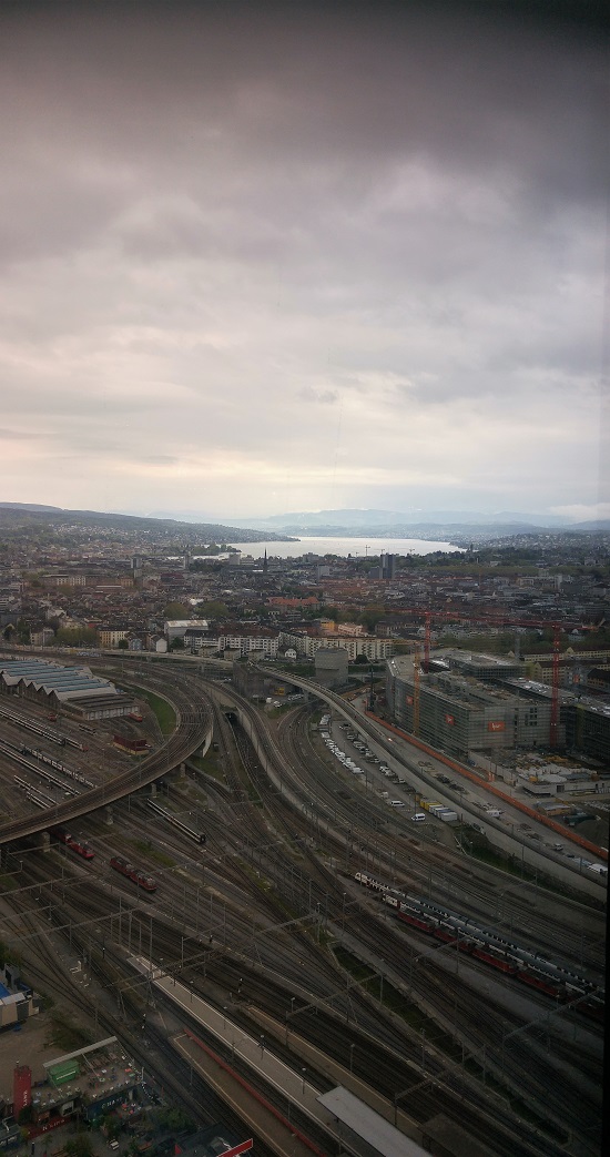 Halusin viedä vieraat Zürichin korkeimman rakennuksen yläkerrokseen katselemaan maisemia. Cloudsia on kehuttu, hintoja solvattu ja kuulemma ilman siistiä olemusta, mieluiten pukua, on turha yrittää. Yritimme. Baari oli vielä kiinni, ravintolaan ei ollut asiaa, joten pääsimme 35:n kerroksen bistroon. Kaiken hypetyksen jälkeen pudotus todellisuuteen oli väkevä. Bistro oli täynnä lapsiperheitä burgerilla, turisteja kännykät ojossa, ilma sakeana jotain määrittelemätöntä keittiön ja hengityksen hapetonta tilaa ja palvelu äärettömän hidasta. Istuimme suttaiselle sohvalle kuitenkin; kahvia oli saatava. Ja olihan näkymä upea. Mekin kaivoimme kamerat esille, sillä vaikka Alpit olivat pilvien takana, avautui tästä uusi näkökulma Zürichiin, raiteiden kaupunkiin.