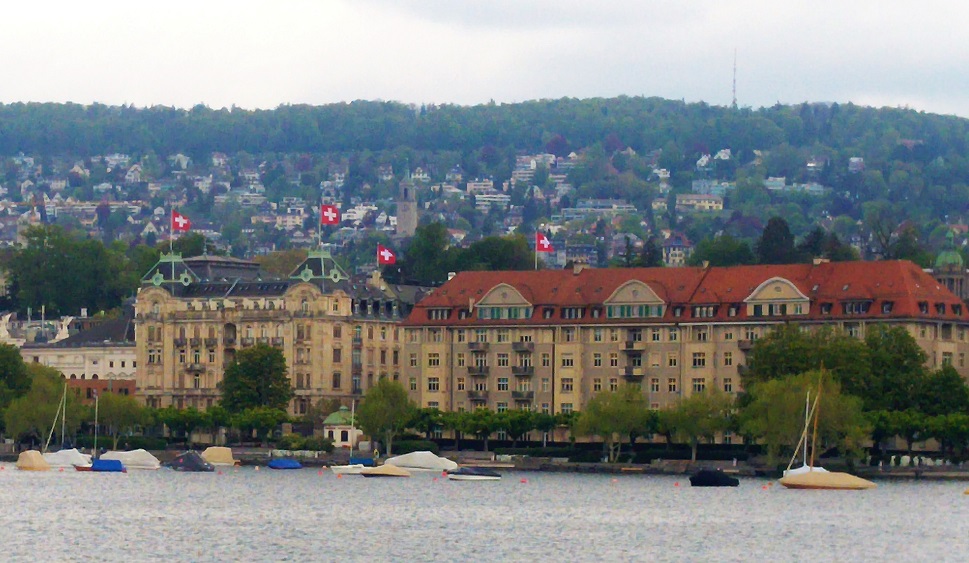 Meille laiva on ollut yksi kolmesta kulkuvälineestä, joka vie keskustaan. Harmittelin, ettei tätä arjen luksusta enää ole esiteltäväksi vierailijoille. Lehden mukaan laiva ei pysähdy kylän laiturissa; ei kannata, koska tulijoita on niin vähän. Ehkä joku toinen uutinen jäi lukematta, ehkä kyläläiset protestoivat, ehkä tultiin toisiin ajatuksiin, ehkä linja sittenkin tuottaa tarpeeksi voittoa. Pursi kaarsi laituriin, kuten aina. Järveä reunustavien miljoonavillojen jälkeen Zürichin profiili tarkentui harmaana ja tummana. Ainut väriläikkä matkalla on hotellin sateessa lepittavat Sveitsin liput.