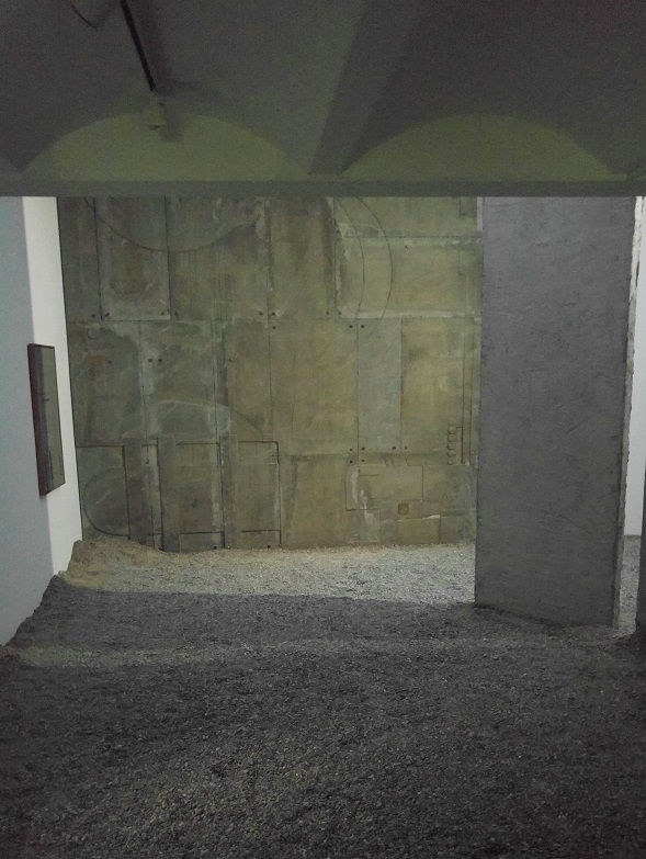 Jos edellisessä huoneessa oli valo, täällä vallitsi pimeys, rosoisuus ja kovat pinnat. Sementtitasoille sai nousta. “Annattehan silmien tottua hämärään.” Tanskalaisen Kirstine Roepstorff oli lapioinut paikalle aimokerroksen maa-ainesta, joka muuttui seuraavassa tilassa hiekaksi. Ajattelin sitä pölyä, joka nousee ilmaan. Yskitti. Nauratti. Se yksinkertaisuus, kaunistelemattomuus ja ne kulmat, joihin olisi voinut lyödä pään.