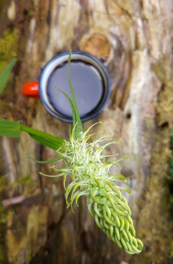 Leiri/Camp.Evästä. / Snacks.Kukka tunki kuvaan. /Flower wanted also to the picture.Mahtava kukka, eeh, luulisin./Wonderful huge flower, or is it?!