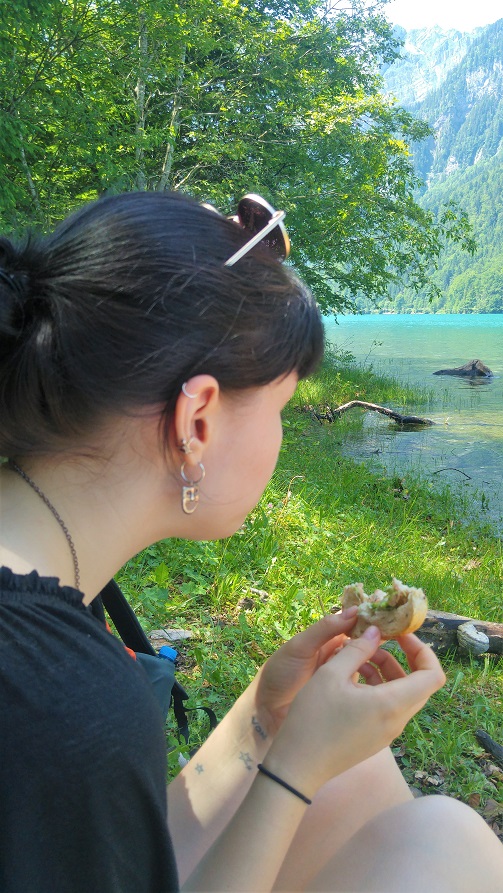 Toisessa päässä järveä alkoi silmissä siinnellä jäätelö, mutta suunniteltu pysähdyspaikka oli kiinni. Puolen kilometrin päästä löytyi toinen. Saimme jätskit, katselimme kuinka lehmät tarpoivat järvessä maha vettä viistäen ja suunnittelimme paluumatkaa postibussilla järven toiseen päähän. Jätski ja nesteytys kuitenkin toimi ja lähdimme tarpomaan polkua takaisin.