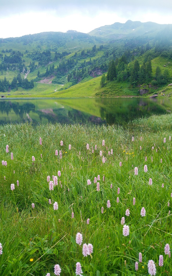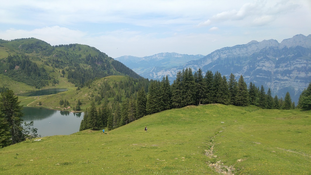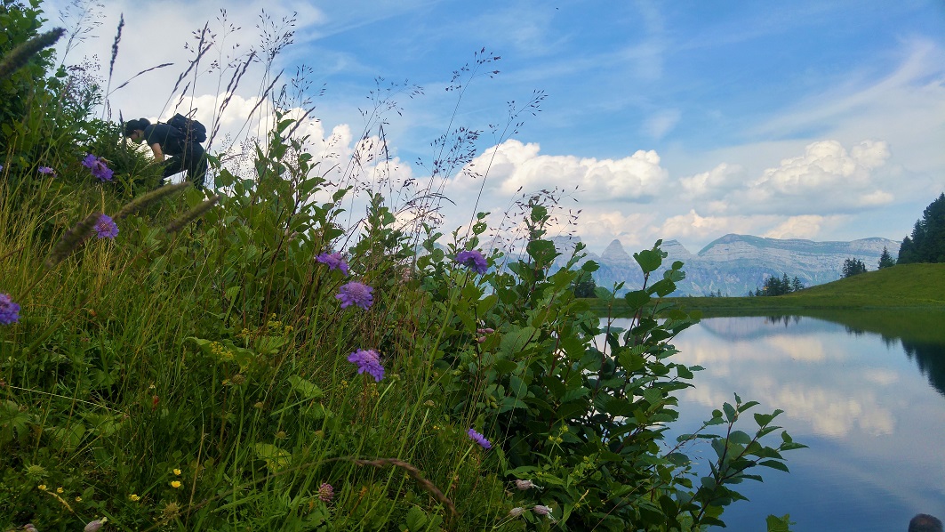 Alhaalla siinsi kaksi pientä järveä, jälkimmäisellä heittäydyimme alppiniitylle heideiksi. Jalkoja keitti, puolipilvinen sää päätti juuri nyt muuttua hiostavan kuumaksi. Eväs maistui paremmalta kuin koskaan, vaikka oli taas melkein samaa kuin joka retkellä.