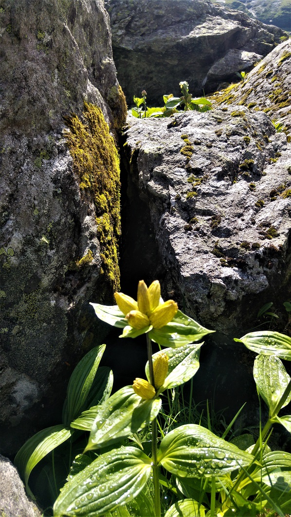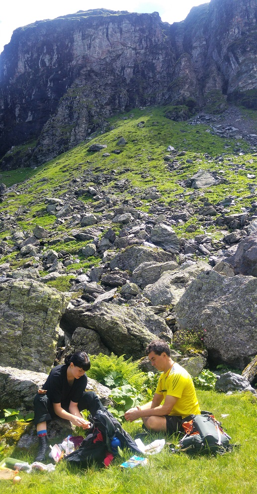 Toista tuntia tallattuamme, noin 300 korkeusmetriä takamme, todettiin, että nälkä kolkuttelee. Pienen joen toiselta puolen löytyi hiukkasen kostea pikkuniitty, ennen kivikkoa. Siihen katettiin pöytä. Vakiintuneet eväät mukana: voileivät, porkkanoita, kurkkua, tomaatteja, kananmunat, pähkinöitä ja herkkuja. Sillä retki, jolla ei ole herkkua, on tylsä retki. Kahvikuppi eli termarin kansi, jouduttiin jakamaan, sillä varsinaiset retkikupit unohtuivat kotiin. Samoin kuin kiikarit. Hieman närästi, sillä lähimailla kovaäänistä vihellystä pitäviä murmeleita olisi ollut kiva tarkastella lähempää.