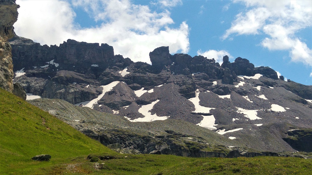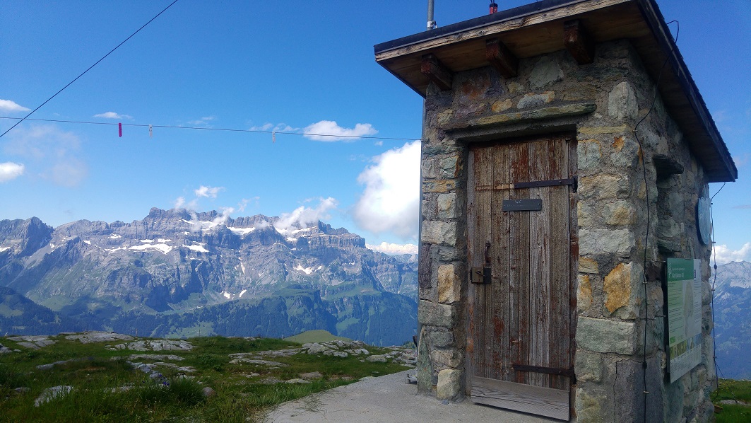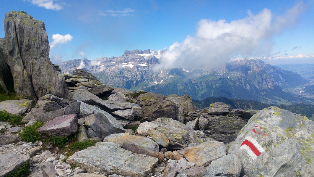 Maasto oli jyrkimmillään viimeisillä metreillä, sillä Leglerhüttelle päästäkseen on kiivettävä vuorenharjanteen yli. Oikealla puolen avautui näkymä Glarusin laaksoon, vasemmalla oli kivikkoista seinämää ja lunta.