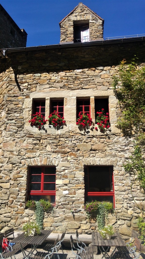 Huutelimme Pacoa, sillä maassa oli koiran lelu, mutta koko alue oli tyhjillään, ei ketään missään, vain pitkäkarvaisia ja pitkäsarvisia lehmiä. Löysimme kassan, johon pyydettiin laittamaan 5 Fr per nenä sisäänpääsymaksuksi. Sen vierestä pääsimme kurkistamaan toistatuhatta vuotta vanhaa kasteallasta ja kirkkoa. Näillä hoodeilla ovat yöpyneet roomalaiset, pyhiinvaeltajat ja kauppiaat.
