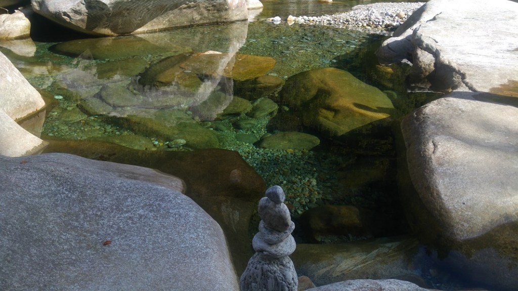 Polulla on yhtäkkiä portaat alas. Sieltä näen toiset kyltit. Tämä on se paikka, josta voi joko jatkaa neljä tuntia eteenpäin tai kaartaa takaisin asemaa kohti. Istahdamme hetkeksi toiselle snäkkipaussille ja pähkäilemme, kääntääkö selkä vihreälle järvelle vai lumihuipuille. Järvi häviää kisan. Auringossa on lämmin; ehkä viimeisiä päiviä teepaidassa.