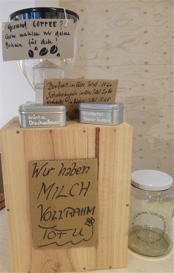 En resumen: En Zürich hay unas tiendas, donde se puede comprar productos sin empaque: ecológico y además divertido. De Chez Mamie en un estante encontramos también nuestra familia: azúcar de caña de Costa Rica, se había colocado muy bonito a la par del azúcar de abedul de Finlandia.