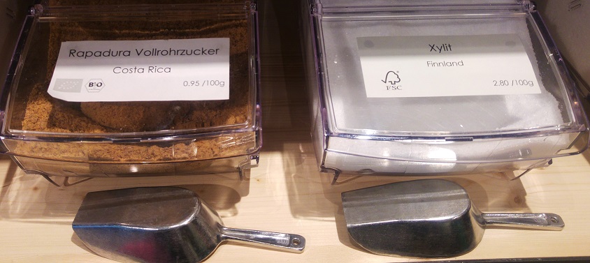 Kurzgesagt: In Zürich gibt es einige Läden, wo man die Produkte ohne Verpackung kaufen kann: ökologisch und es macht spass. Wir haben in Chez Mamie auf einem Regal auch unsere Familie gefunden: Rohzucker aus Costa Rica hatte sich so schön neben dem Birkenzucker, Xylit, aus Finnland, plaziert.