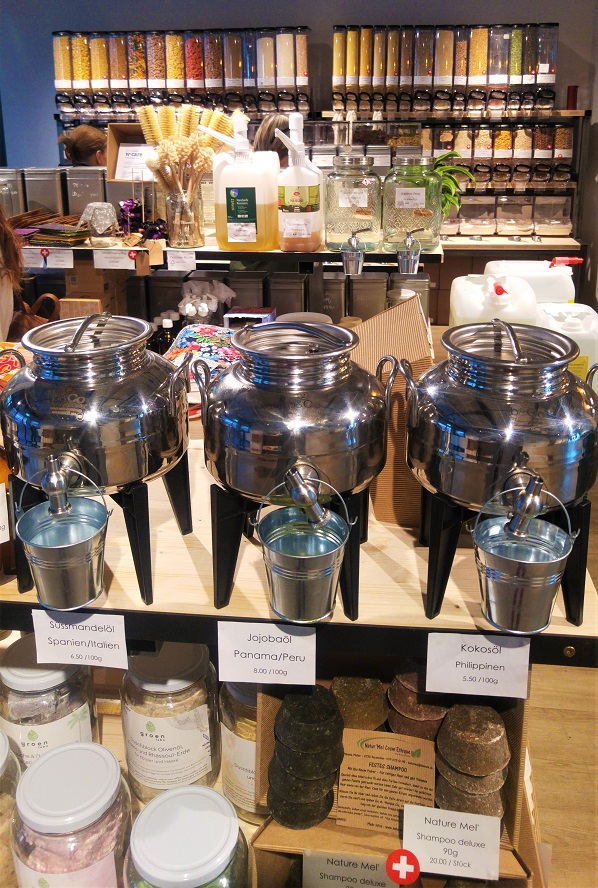 Foifi on oman reittini sivussa, mutta tykkään käydä siellä, jo pelkästään ilmapiirin vuoksi. Chez Mamiella on kaksi liikettä Zürichissä ja ympäri Sveitsiä sisarusputiikkeja. Foifi ja Chez Mamie ovat hyvin samantyyppisiä, ideana se, että kaikki mitä vain suinkin voi, myydään ilman pakkauksia tai purkeissa, joita voi käyttää uudelleen. Chez Mamiessa vallitsee myös luomu ja luontoystävälliset tuotteet.