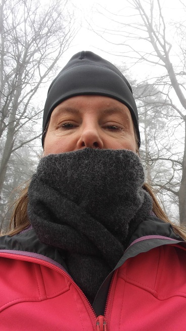 Tämänhetkinen sää ei tunnu auttavan, sillä vaikka kostean väitetään olevan hyvä astmaiselle, on kylmä kostea minulle epämiellyttävä. Zürichiä peitti hyytävä sumu usean päivän ajan ja se tuntui tunkeutuvan luihin ja ytimiin. Lähdimme silti lenkille ja kiedoin kaulan ympärille paksuimman löytämäni huivin. Tiesin hikoilevani kuin porsas, mutta väliäkö tuolla, kunhan saisin hengitettävän ilman siedettävämmäksi. Liikkeellä näin kuvajaiseni heijastuvan naapurikylän lihakaupan ikkunaan ja kyllä, pankkirosvolta näytin. Nenän yli vedetty huivi kuitenkin toimi, pystyin juoksemaan paremmin kuin aiemmin.