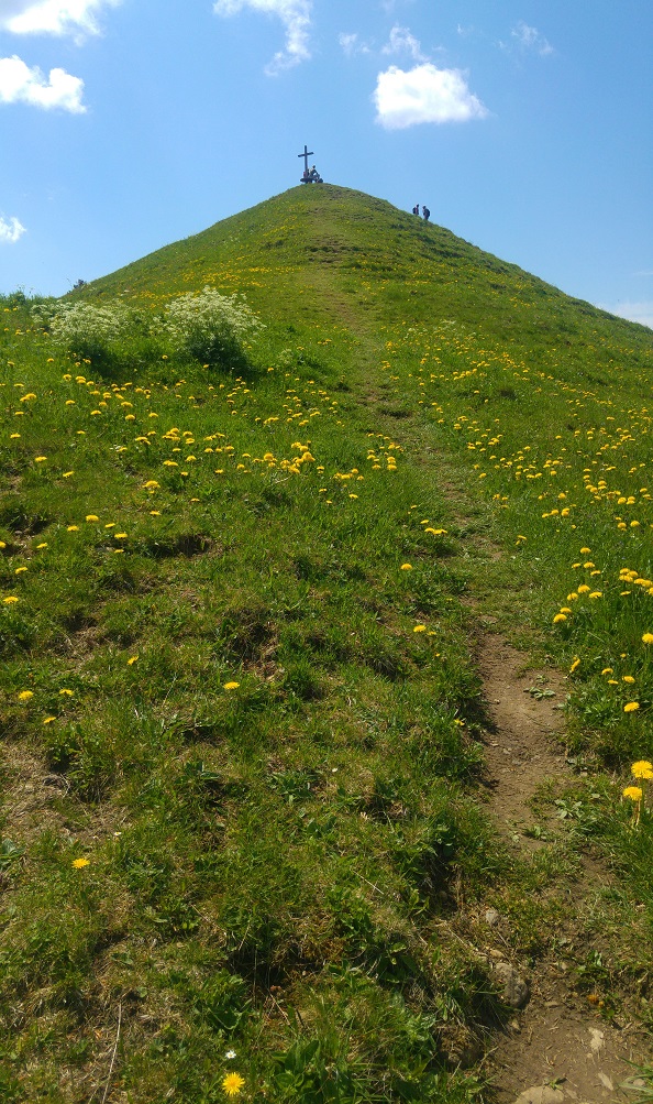 Kukkulan huipulla, 1292 metrissä, tuuli ja parveili väkeä. Kylttien vieressä oli risti ja siinä pieni kaappi, jonka huomasin vasta kuvasta. Kaapista löytyy kirja, jonne huipun saavuttanut voi laittaa puumerkkinsä.
