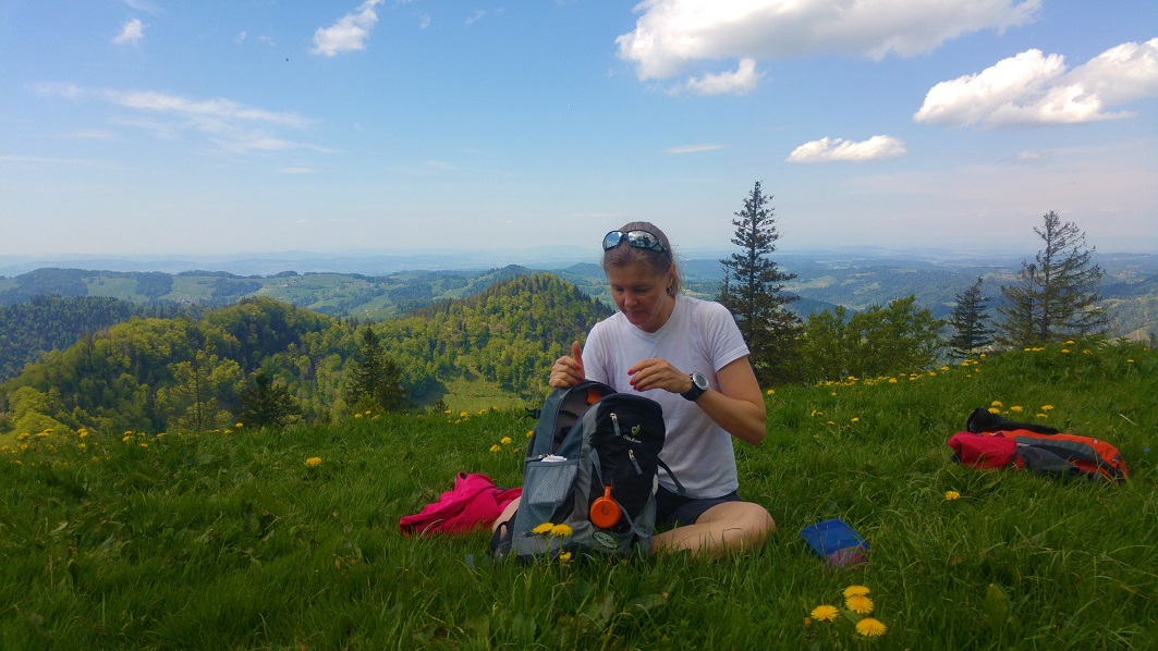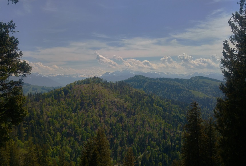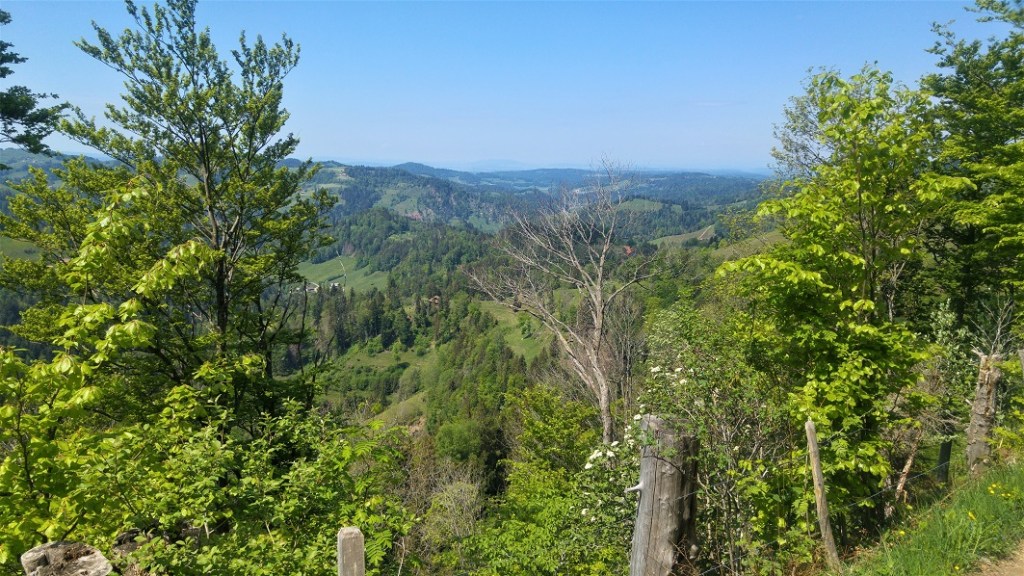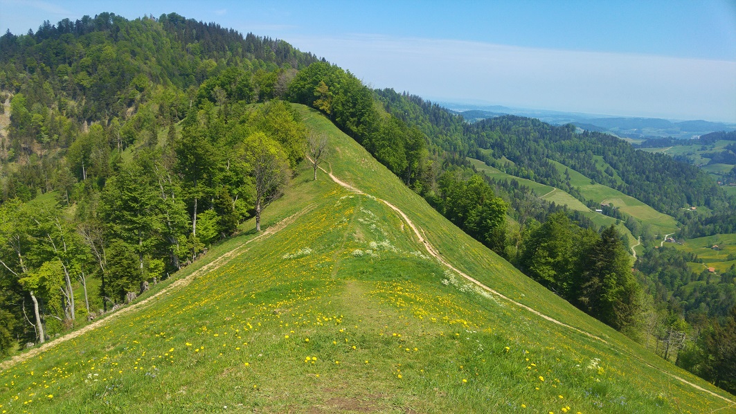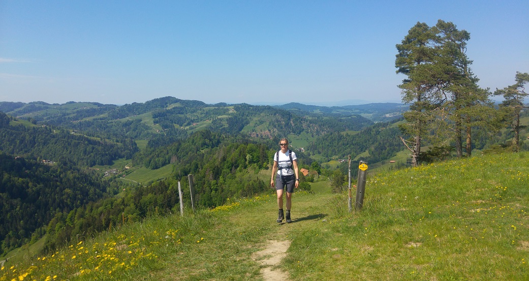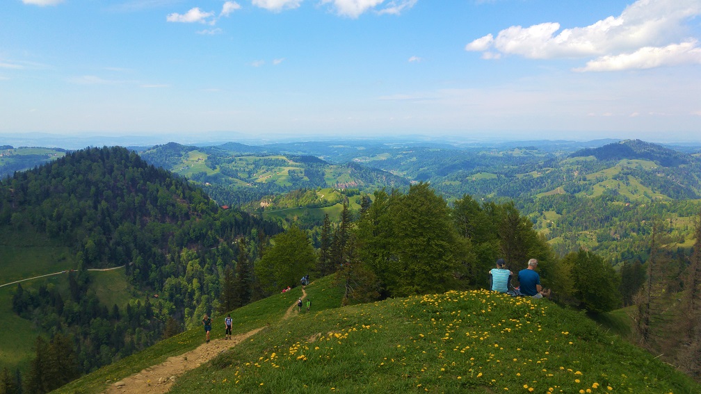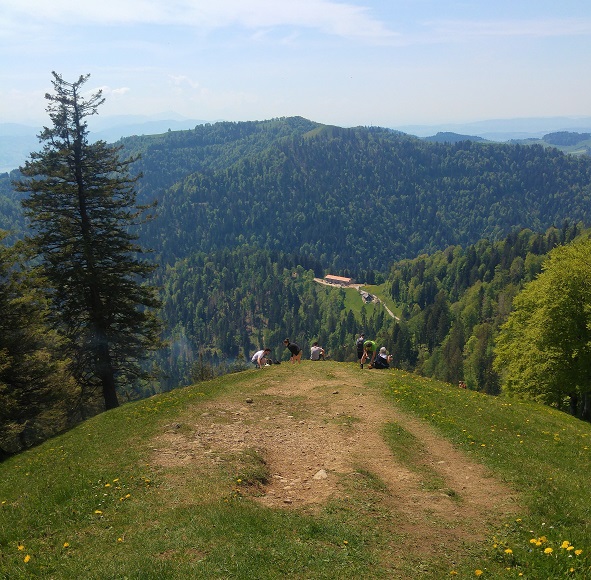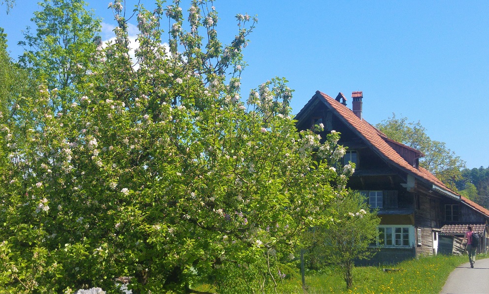 Zürichistä, myös Zürichin kantonista, tulee mieleen kaupunkiseutu, tiheys, mutta myös pellot ja risteilevät tiet. Tämä polveileva maasto oli rehevää ja maaseutumaista. Vuorella olimme uudelleen alkukeväässä; kotona jo ohi mennyt hedelmäpuiden kukinta oli täällä vielä vauhdissa. Toisaalta oli myös kuin Suomen kesä, maastossa kukki kieloja ja käki kukkui lähes koko matkan.