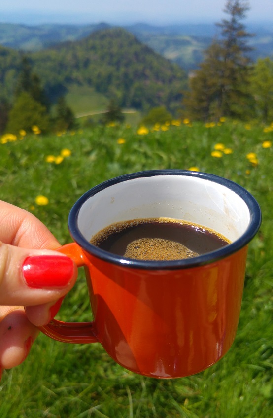 Väkeä lojui pitkin poikin niittymäisessä rinteessä lepäilemässä. Toisella puolen vuorta on kaksi ravintolaa, koronan vuoksi vielä kiinni, joten eväät oli tuotava itse. Nuotiopaikoilla räiskyi tulet ja puhe sorisi.