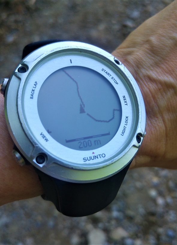Olin laittanut reitin Suunnon urheilukelloon ja onneksi, sillä sanallinen ohjeistus ja viitat eivät olleet yksiselitteisiä. Vuorella risteilee muutenkin useita polkuja ja tämä oli vain yksi suositus. Yritin laittaa kello paussille siksi aikaa, kun Aldo vaihtoi varustustaan, mutta mitään ei tapahtunut. Kotona huomasin, että kello ei ollut tallentanut matkaa tämän pysähdyksen jälkeen. Hiukan harmitti, sillä olisin halunnut reitin kartalle. Ehkä seuraavalla kerralla muistan laittaa päälle automaattisen paussitoiminnon.