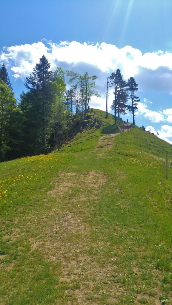 Siispä Schnebelhornille. Sortsit jalkaan, reppu selkään. Polku lähti Stegin asemalta itä-Sveitsissä. Muutama sata metriä katua ja käännyimme polulle, jyrkästi metsään, läpi niittyjen.