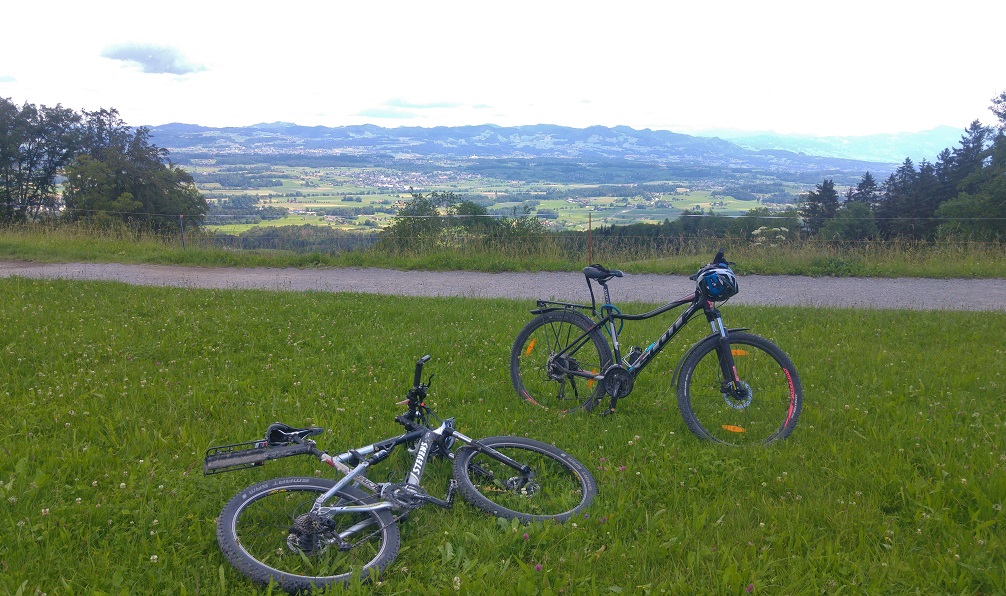 Thuninjärvellä nielaisin kolme metsäkärpästä tai hyttystä, jotain melkoa isoa, läähättäessäni mäkeä ylös. Tänään vältin nämä proteiinipitoiset raakasnäkit. Vatsa kurni vasta ylimmällä huipulla. Parkkeerattiin pyörät nurtsille. Lepohetki, murkinaa ja tuijotusta kaukaisille vuorille. Kolmen paarman piston verran istuskeltiin, sitten olin jälleen valmis lähtemään liikkeelle.