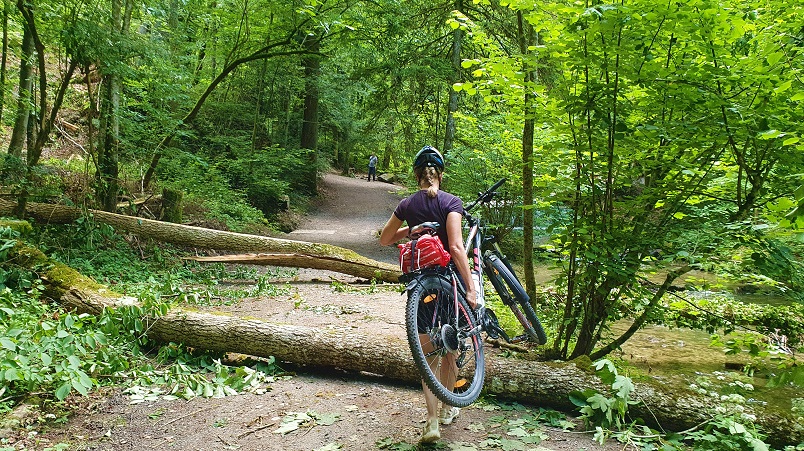 Tämänkertaisen pyörälenkin alkuvaiheessa pääsin kiipeämään puunrunkojen yli pyörää kantaen. 14 kiloinen pyörä nousi yllättävän kevyesti, huomaa, että Thuninjärven lenkillä tuli tätäkin lajia treenattua tavallista enemmän. Ei haitannut, että puhelimen ehdottamalla reitillä oli jälleen sortunutta polkua, portaita, mäkeä, jota valuin takaperin alas työntäessäni pyörää.