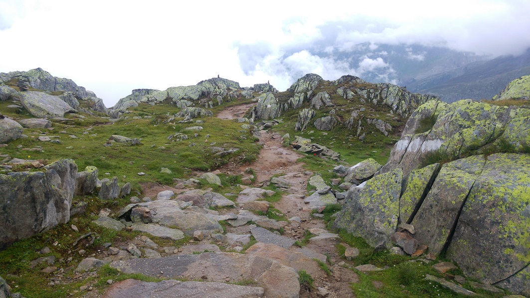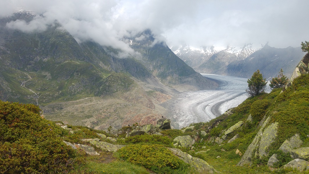 Ylöspäin mennessä keli parani ja pilvet väistyivät Aletsch-jäätikön yltä./But going up the weather got better and the clouds gave us a chance to see Aletsch.