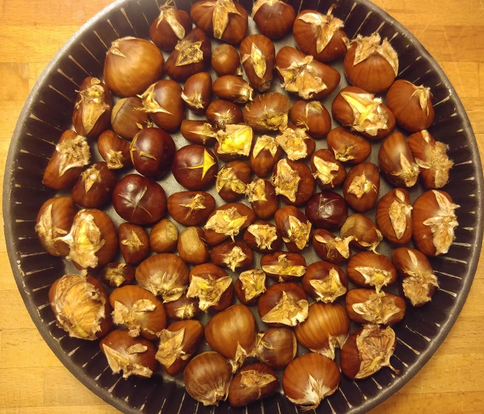 Kierrän kastanjoita joka syksy kuin kissaa kuumaa puuroa. Tekisi mieli, mutta…Nyt niitä oli kotona lautasella hyvähkö annos. Itse kerättyjä Motto di Dongion retkeltä, jos muistatte. Föhn-myrskyä uhmaten ja kirkolta kirkolle kävellen.