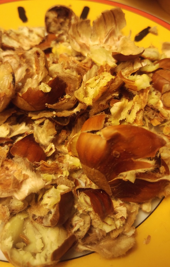 Söimme kastanjoita alkupaloiksi ja kurpitsarisottoa pääruuaksi. Peukaloita aterioinnin ajaan lepuutettuani kävin jälleen kuorintaurakkaan, sillä osa kastanjoista jäi syömättä. Minä en tietenkään viskaa metsän hedelmiä kompostiin. Jotain niistä on synnyttävä.