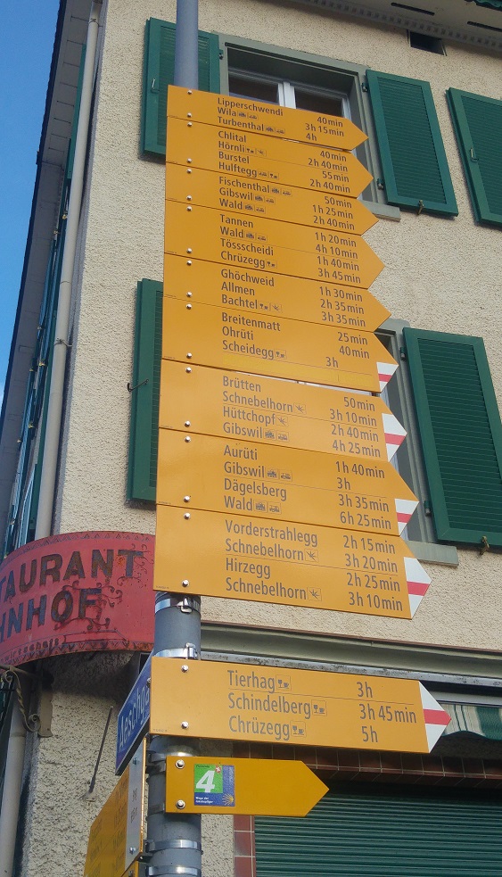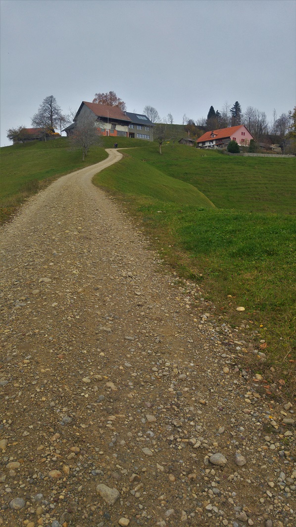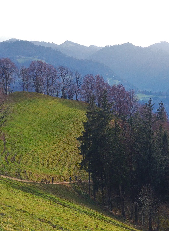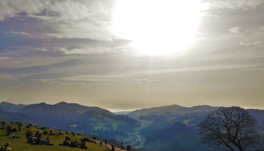 Huttu peittää vuoristojonon niin, että horisontissa on vain aavistus teräväkärkisistä ja lumihuippuisista. Mutta siellä ne ovat. Täältä niitä on hyvä katsella. Tiedetään vuorten olemassaolosta muutoinkin, nähtiinhän ne viereiseltä ja Zürichin korkeimmalta, Schnebelhornilta.