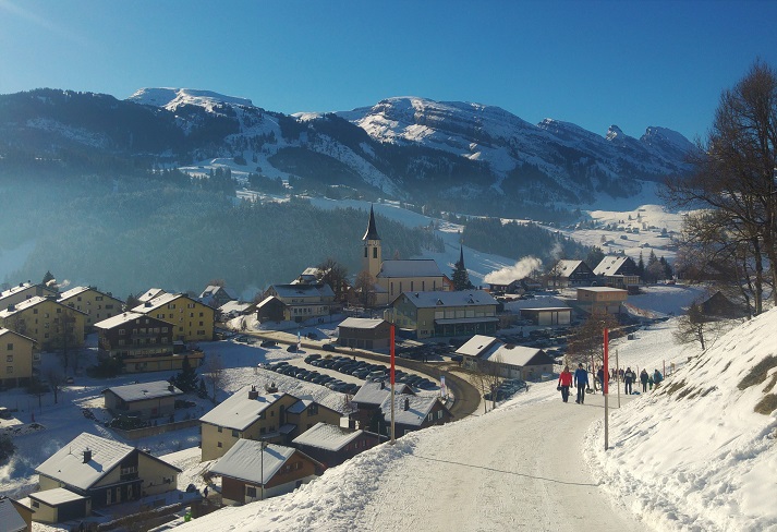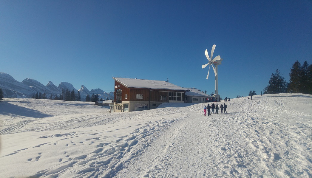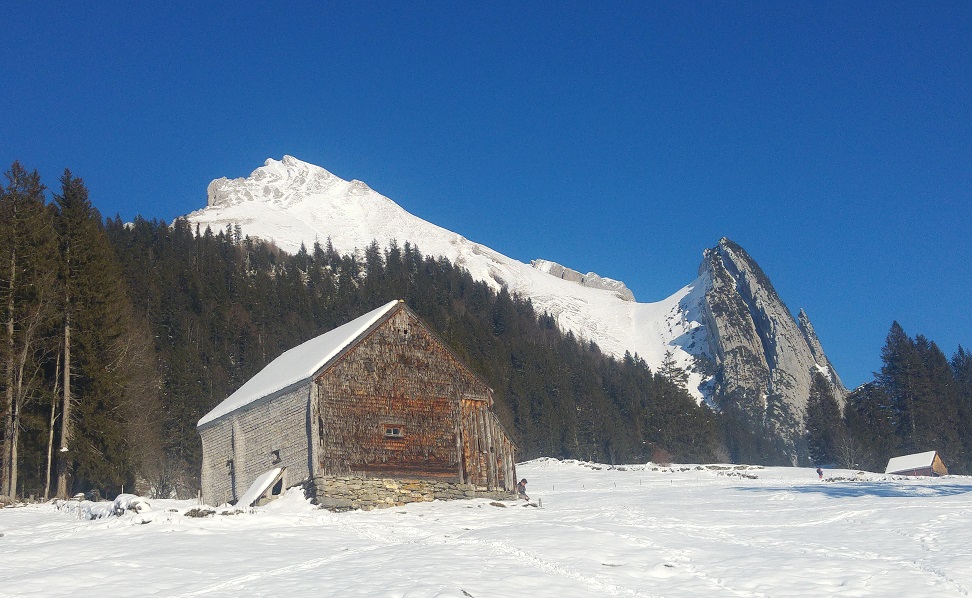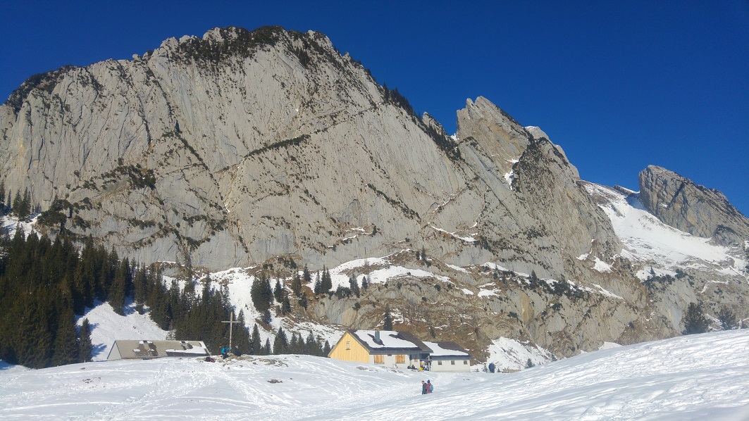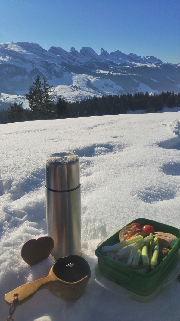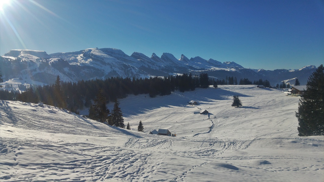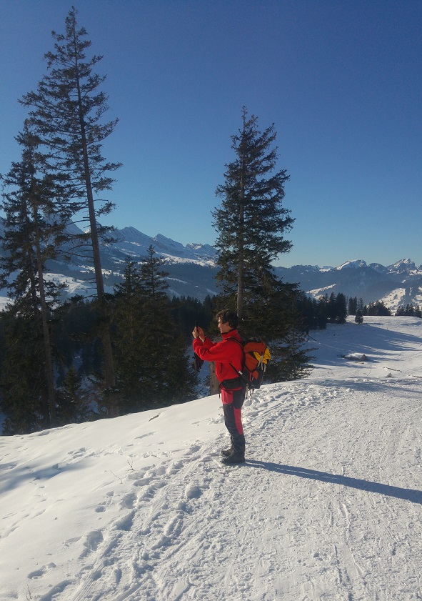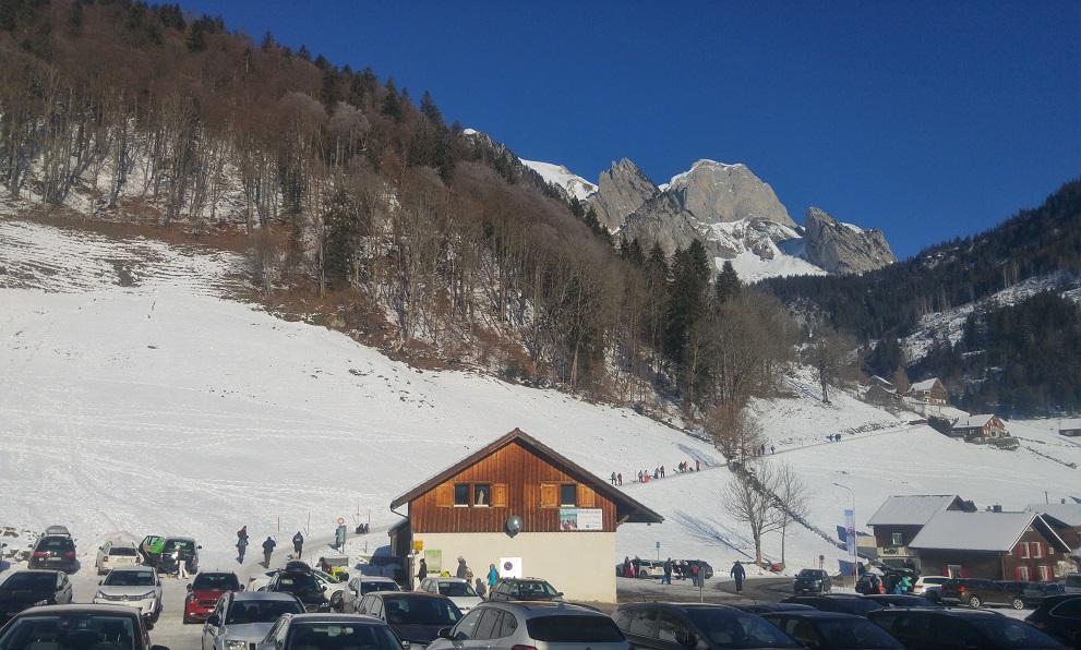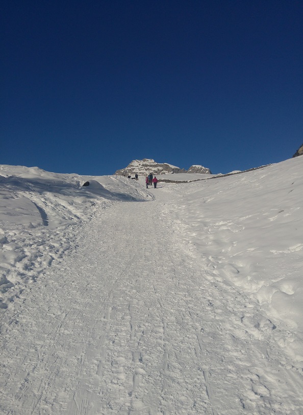 Ensimmäiset metrit mäessä vetivät keuhkoputket suppuun ja tovin kuluttua sen lisäksi, etten saanut henkeä, olin jo hikoillut itsestäni kaiken lähtevän nesteen. Sen verran Sveitsi on opettanut, ettei mäkeä kävellä talvellakaan missään toppahousuissa, ellei ole pilvistä tai lumituisku ja 20 pakkasta. Ohuet vaellushousut välikerroksella oli nekin jo liikaa.