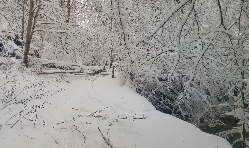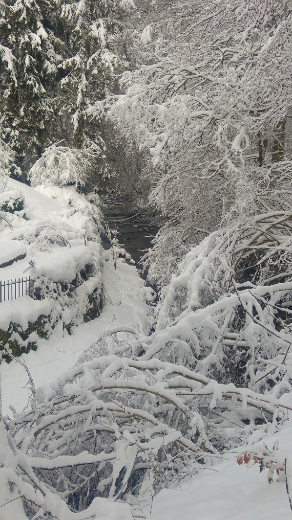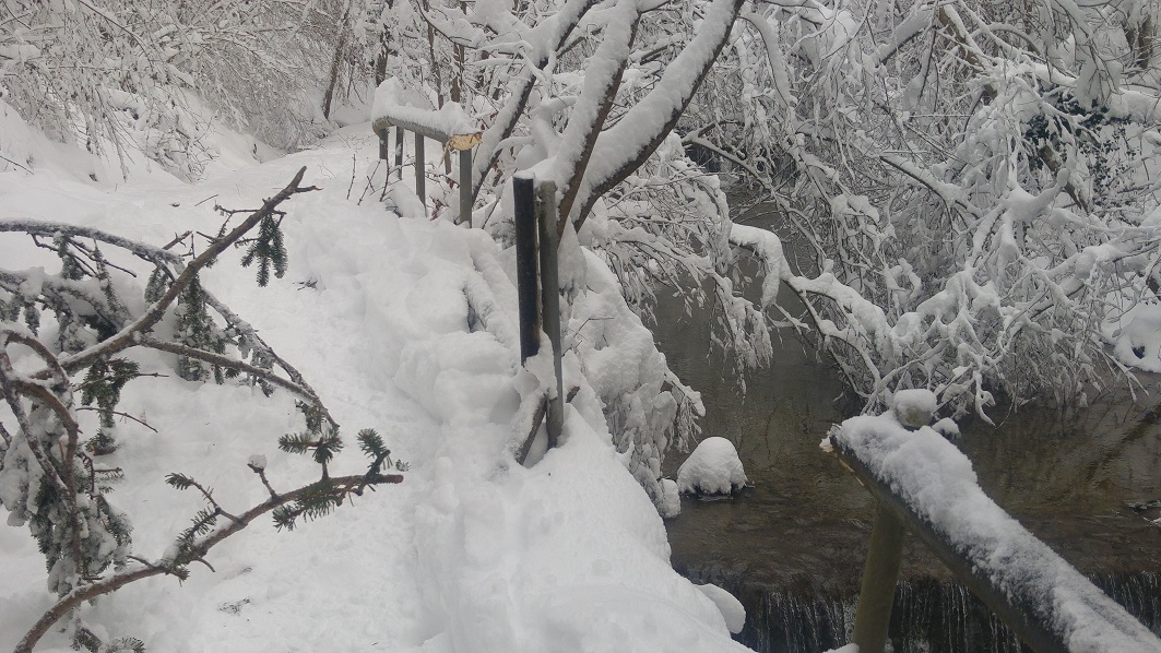 Kaikki puut eivät ole kestäneet painoa. Runkoja on tien poikki, joessa, rinteissä kaatuneina, paksuja oksia maahan pudonneena. Joen partaan korkeimmassa kohdassa kaide on poikki, senkin on vienyt lumen murskaama kuusi.