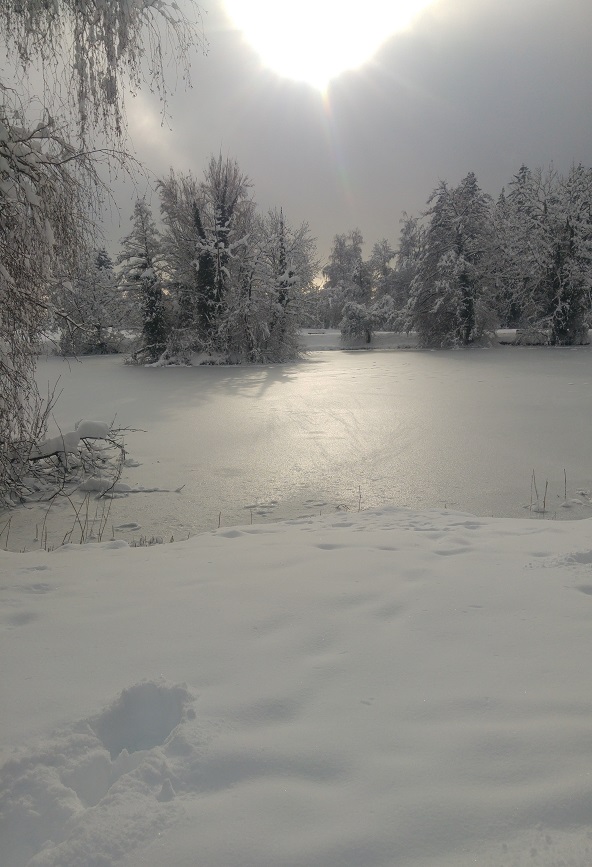 Schübelweiher-järvi on jäässä. Aurinko kumottaa. Mietitään, että mitenköhän Mae-tortugalla menee. Se on siis vesikilpikonna, joka asuu näissä vesissä. Talvehtimiseen se tarvitsisi kai avointa vettä. (Mae tarkoittaa tyyppiä Costa Ricassa. Aldo on sitä mieltä, että hän ja kilpikonna, tortuga, ovat kotoisin samoilta seuduilta.)