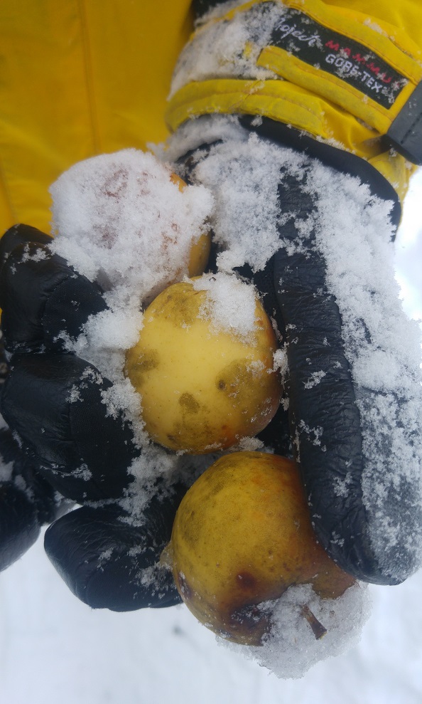 Aldo ravistelee puusta lumet niskaansa, on vielä otettava viimeiset omenat mukaan. Ovat minusta kyllä jo aika eilisiä, etten sanoisi puolimätiä. Aldon mielestä pakastettunakin makoisia.