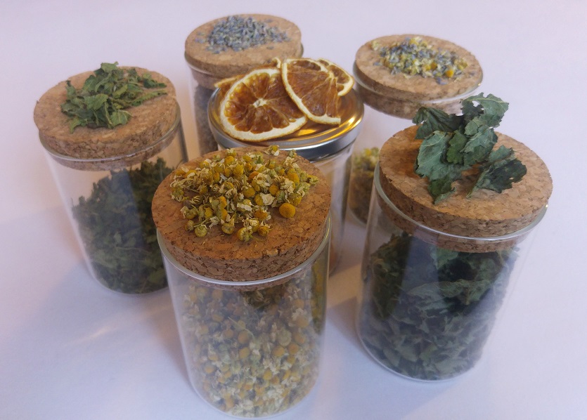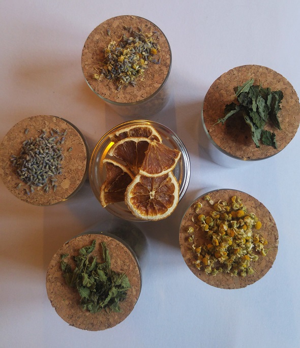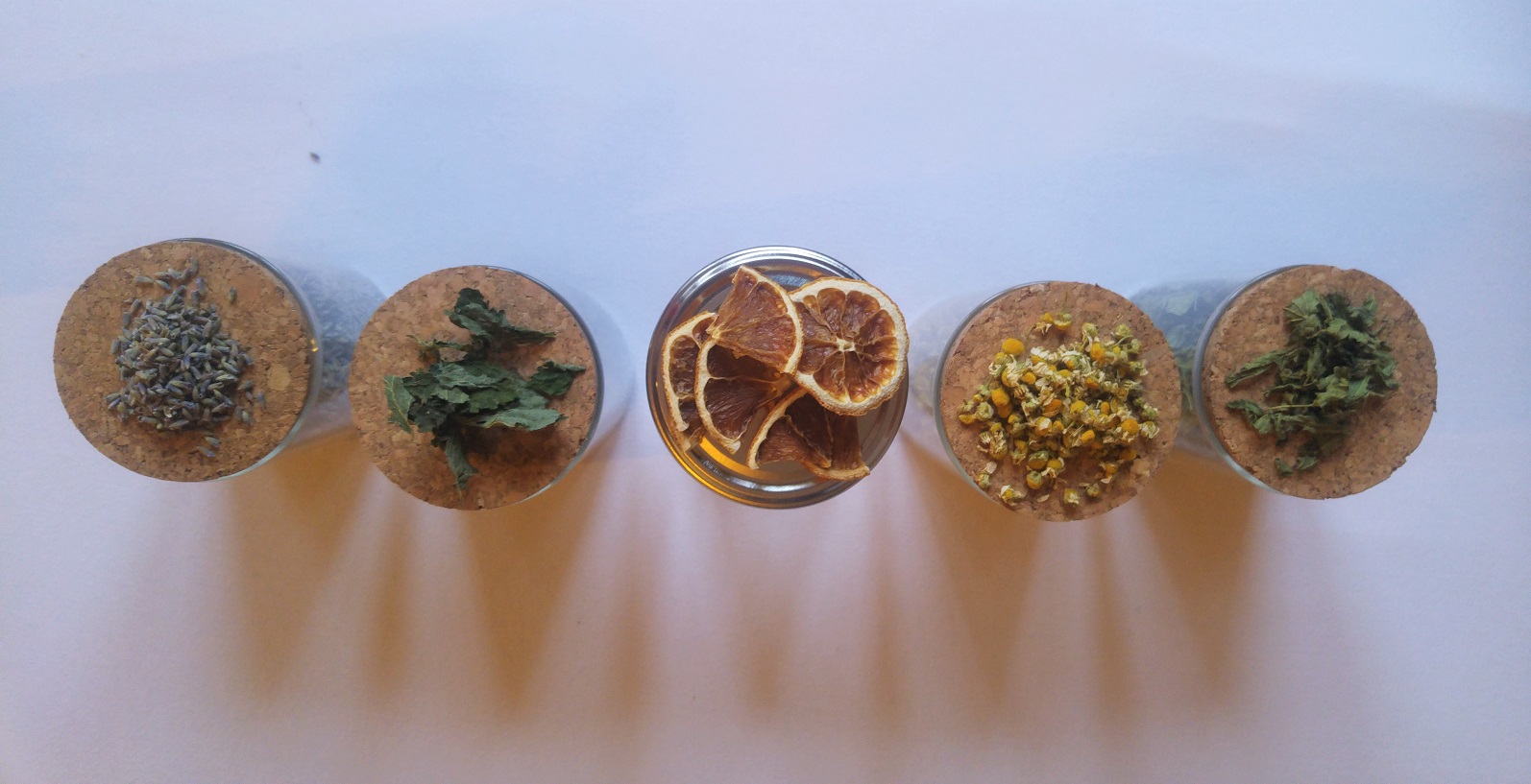 Kamomillaa, sitruunamelissaa, nokkosta, laventelia ja kuivattua appelsiinia teemukiin.