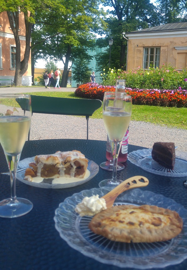 Aterialla meitä oli terassilla kaksi seuruetta. Se toinenkin Sveitsistä. Mies ihmetteli kauppatorin liepeillä näkyvää rakennusta, jossa oli Ruotsin lippu. Rouva tiesi, että täällä on käytetään molempia lippuja, sekä Suomen että Ruotsin.