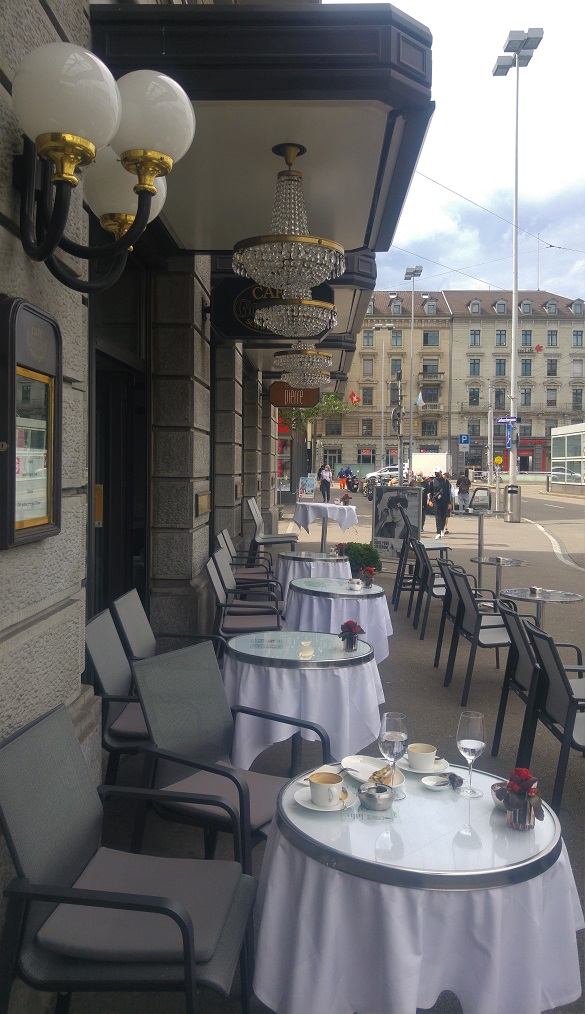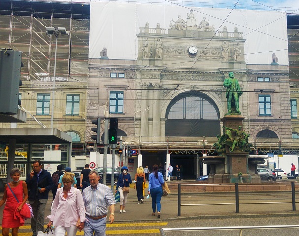 Tämä on siis ollut yhtä feikki kesä kuin nyt tunnelma kaupungilla. Konstruktio, johon halutaan uskoa. Zürichin rautatieasemakin on verhoiltu kankaalla, johon fasaadi on maalattu. Sekään ei ole oikea. Terassikahvilat ovat tyhjillään, jäätelökärryt katoksen alla suojassa sateelta, laivat ajelevat ees taas suht tyhjillään ja lähteet pulputtavat vettä, eikä kenelläkään ole jano.