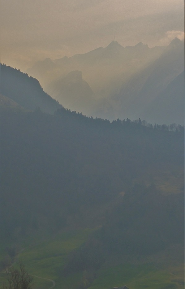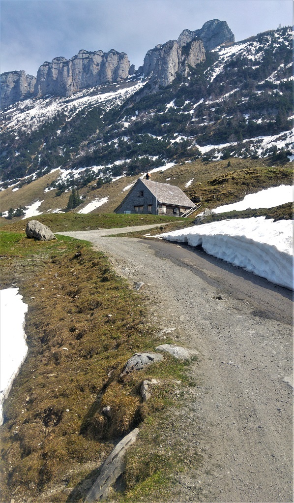 Sämtiserseelle Appenzellissä vievä tie nousi jykevästi kuten asiaan kuuluu, puhtoisena ja tyhjänä. Sivupoluille ei ollut asiaa -lunta- mutta sen olin työstänyt jo etukäteen; tänään noustiin huoltotietä, onhan meneillään rospuuttokausi.