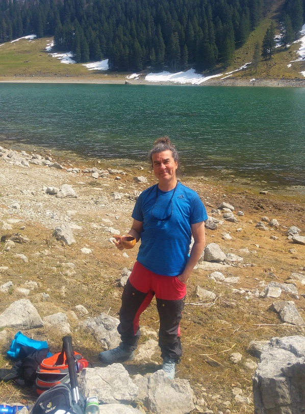Järvi on solamaisessa laaksossa ja tuuli puhaltaa lähes aina. Aurinko yritti lämmitellä usvan takaa ja eväitä kuorittiin esille olevinaan kummun suojassa, ainakin pienemmällä viimalla. Kevään kuivuus näkyi kutistuneena alppijärvenä. Rantaa oli metreittäin enemmän kuin tavallisesti.