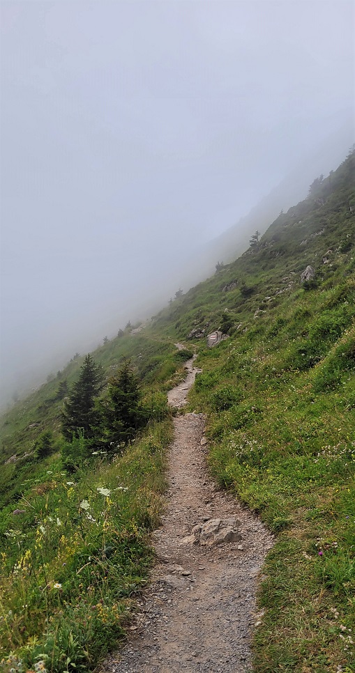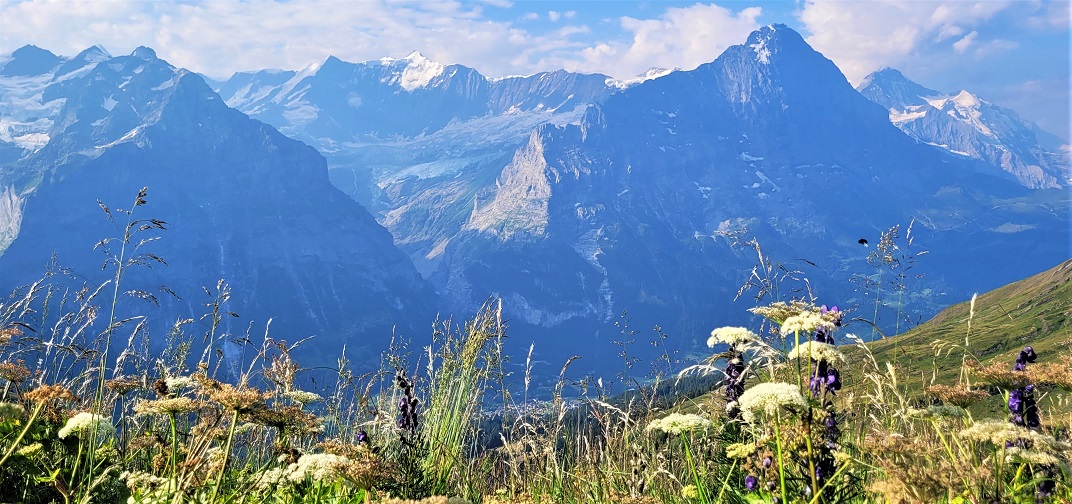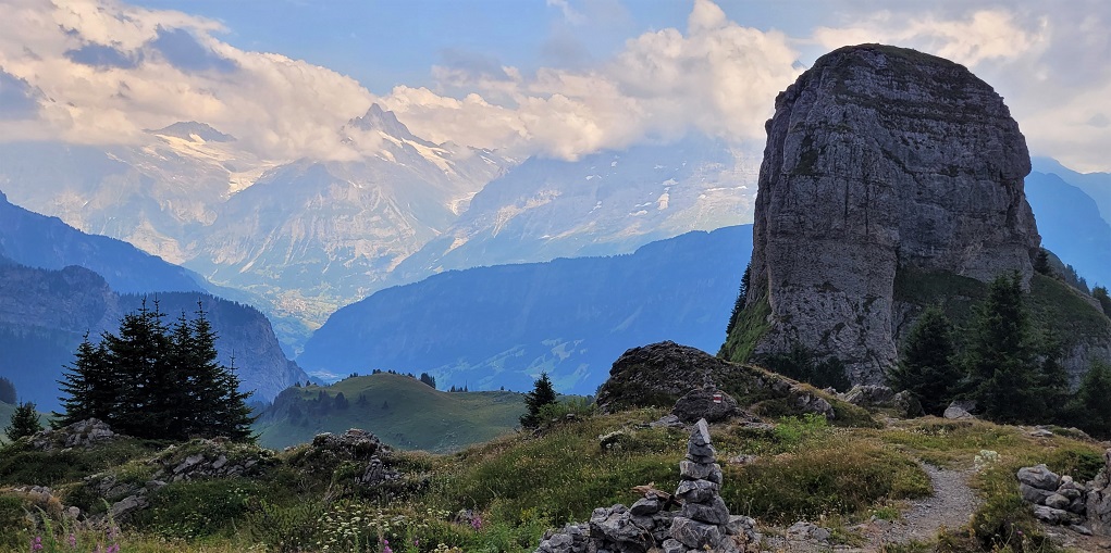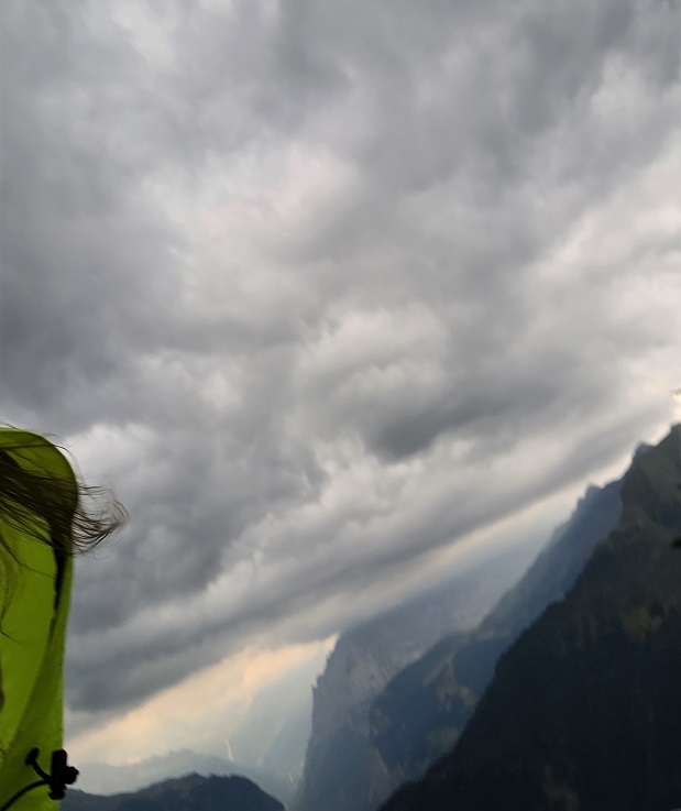 Jokunen sata metriä ennen Schynige Platten rakennuksia nousi pyörteinen tuuli. Yritin kiskoa takkia ylleni, se halusi lentää taivaalle, kädessä oleva kännykkä myös. Pilvet tulivat kovaa kyytiä ukkosen puolelta peittämään meidät, laskeutuivat viereen, alemmas laaksoon, pyörähtivät takaisin. Maisema vaihtui sekunneissa moneen kertaan.