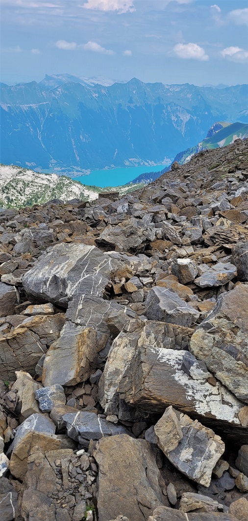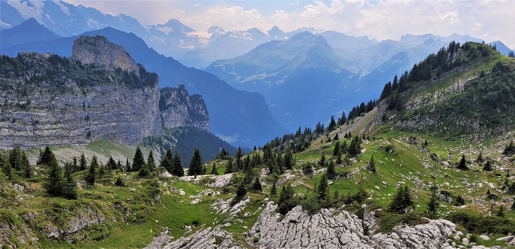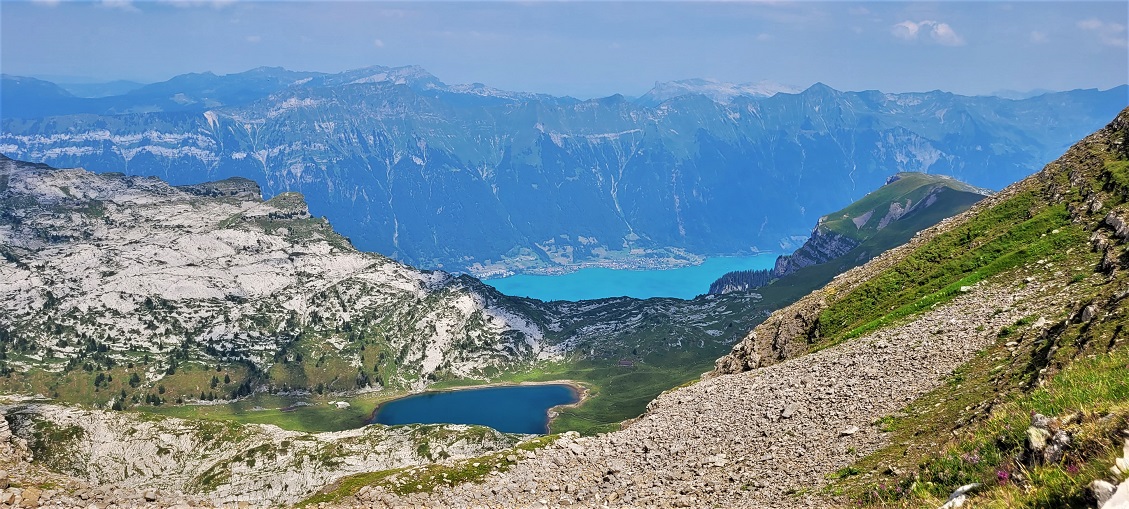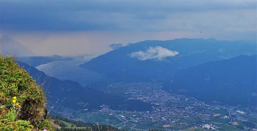 Mutka mutkalta, alas ja ylös, lähestyimme Schynige Platten harjannetta ja muutaman harhautuneen pisaran lisäksi avautui näkymä järville, Brienzerseelle ja oletettavasti Thunerseelle. Sinisenharmaa, lilahtavakin, välkkyviä salamia ja jokunen jyrähdys. Siellä se oli, vuorten toisella puolen.