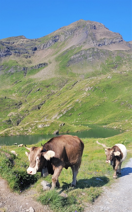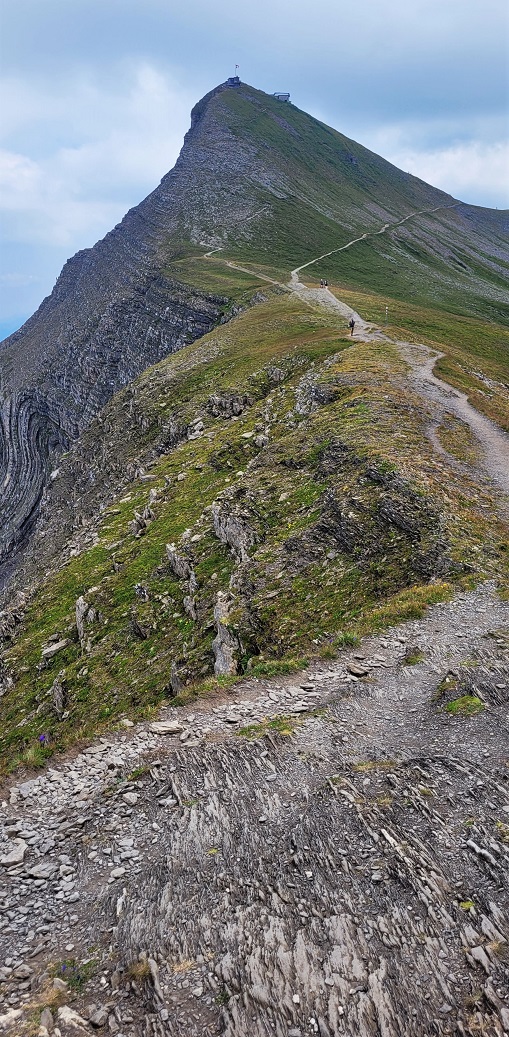 Ennen viimeistä siksakkia Faulhornin huipulle tie oli täynnä. Juttelin lehmälle, että josko se antaisi tilaa. Juttelin myös sähköaitaa virittelevälle isännälle, sillä hän paikallisena varmaan tietäisi säästä. “Ei mitään hajua”, hän sanoi ja räpläsi puhelinta. Sieltä varmistettuaan uskalsi kehottaa matkaan. Jos huipulle nousun jälkeen jatkaisimme välittömästi matkaa, ehtisimme ohittaa säälle armottomimmat kohdat ennen rajuilmaa3.