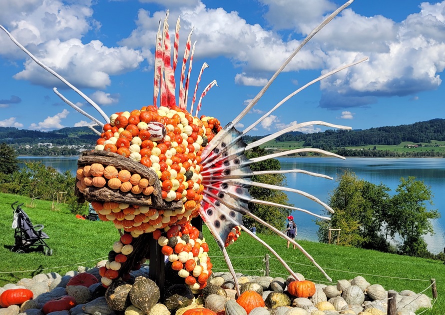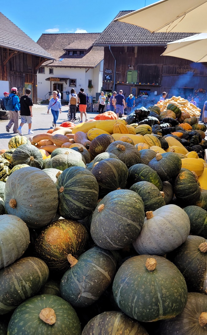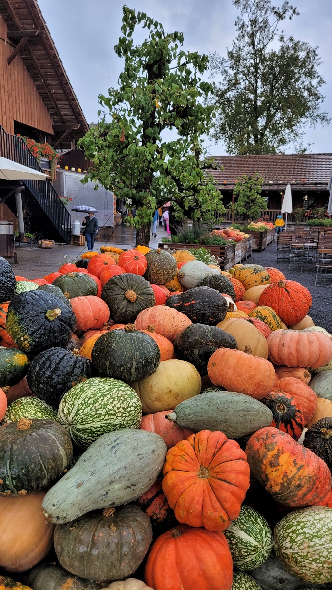 Rapperswilissa oltiin päivän ensimmäisinä asiakkaina koputtelemassa ensiapuvaunun ovelle. Desinfinointisession jälkeen pohdittiin sadetilannetta, joka oli kääntymässä rankaksi. Jos vielä vähän eteenpäin, Bächlihofin kurpitsafarmille, ajattelin. Sieltä löytyisi katosta ja ruokaa.