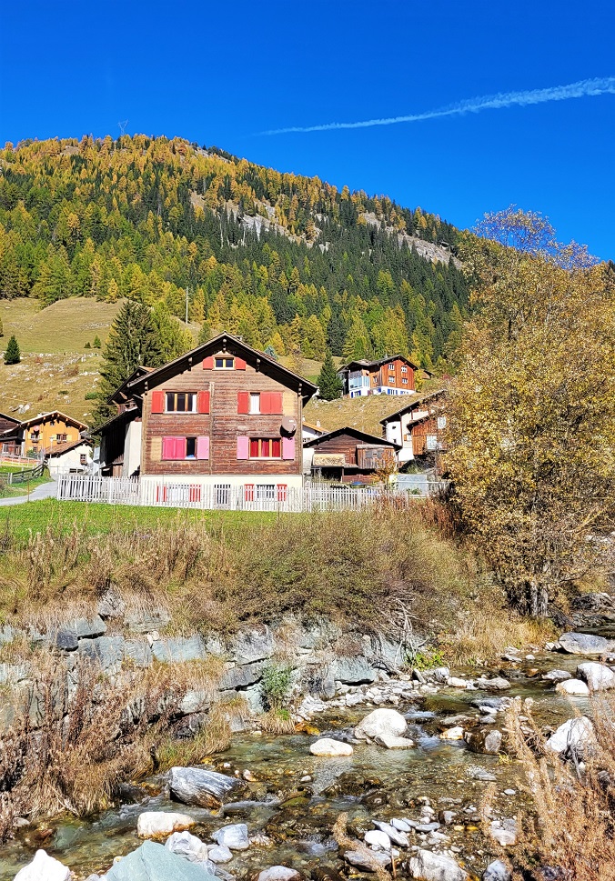 Eväspaussille pysähdyttiin Sufersiin, keltaisten lehtikuusien koristaman rinteen viereen. Istahdettiin kiville kuivahtaneen joen partaalle, sen saman, missä kerran patikan jälkeen uiteltiin vuolaassa virrassa jalkoja. Vai oliko se tämä reissu?