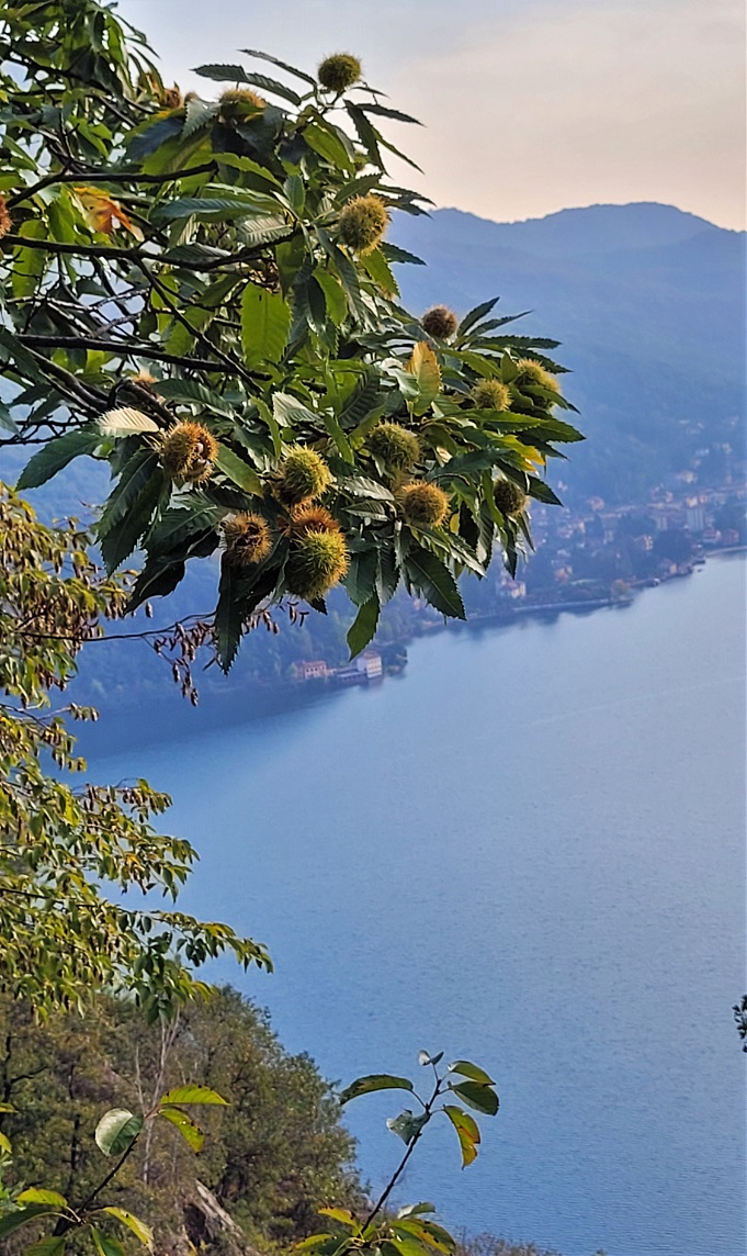 Ihan täyttä aurinkoa ei päivä tarjonnut, alkuun sumuista huttua ja kastanjametsässä varjoa. Kolmen tunnin patikasta tuli varmaan neljä, sillä kuvailin samalla paikkoja virtuaalimatkaa varten. (Lähtisitkö mukaan?!) Kapusimme vuoren laen yli ja laskeuduimme sen toiselle puolen, taatusti tuhat rappusta alaspäin aina järvelle asti.