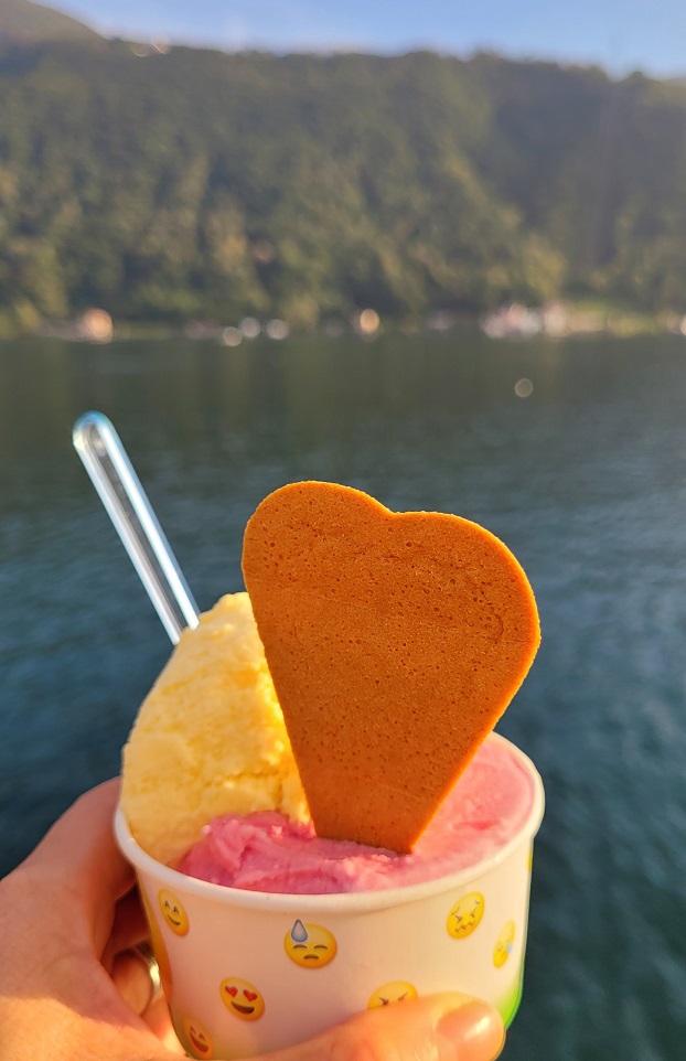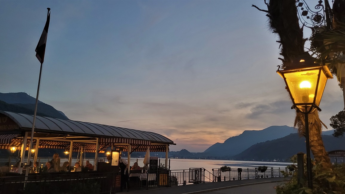 Mobiilinetti ei pelannut, oli käveltävä takaisin wlanin luo majapaikkaan etsimään ratkaisuja nälkään. Hoipuin energiapulassa, eihän voi olla ettei Italiassa saa ruokaa! Pyörsimme takaisin aperopaikkojen lähelle; baarin ruokalistalla oli sentään pizzaa. Päällä oli kaikki pakaaseista löytyvät kerrokset, myös yökäyttöön tarkoitettu huppari, silti paleli; mutta miten kauniisti valot tuikkivat järven molemmin puolin.