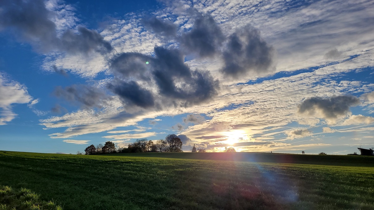 Näiltäkin kahden kadun markkinoilta tupsahdin toisesta päästä ulos aika sukkelaan. Kukkulan niitty oli kuin Teletapeista suoraan, se kylpi ilta-auringossa siluettihahmoin koristeltuna. Pilvet olivat väistyneet sen verran, että Alpit näkyivät mutka toisensa jälkeen uudesta kulmasta, ensin yhtenä valkoisena röpöreunaisena massiivina, lopulta upeana kimmeltävänä rivistönä järveen taustalla.