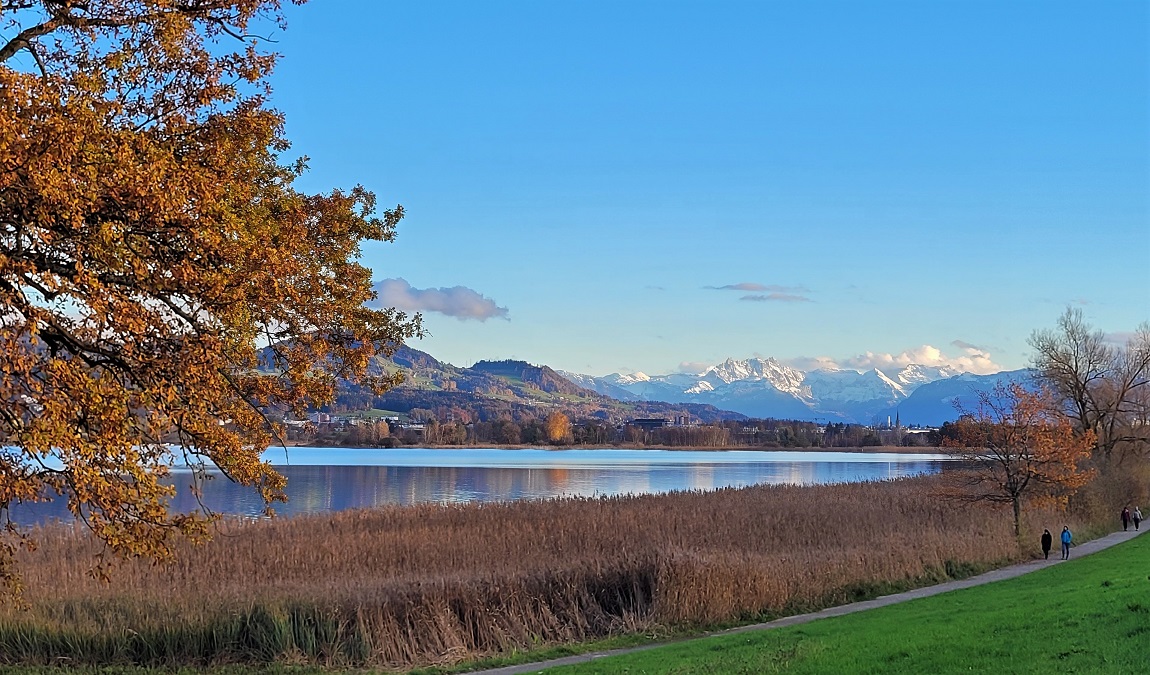 Toinen varhainen tapahtuma on Seegräbenissä, pikkukylässä Pfäffikerinjärven laidalla. Käytiin aamupäivällä lyhennetyllä juoksulenkillä, jotta pattereita riittäisi vielä kävelyyn rantatiellä. Syysvärit ovat vielä kauniit, valo kuulas; niitä piti vähän katsella. Kinttujen jaksamisesta ei siis ollut kyse, vaan vatsasta; halusin säästää lounaan markkinoille.
