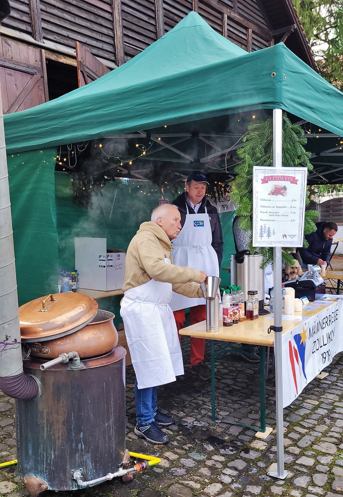Miesten jumppakerhon pöydän edustalla jono oli jopa pidempi kuin kastanjoiden paahtopisteen luona. Maustettua viiniä kauhottiin pömpelistä kuppeihin ja se oli hintansa väärti, kuumaa sekä ilahduttavaa.