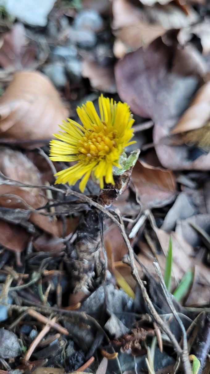 Alhaalla laaksossa oli vieläkin viileämpi, ehkä joesta hönkäävän kosteuden takia. Silti sen vierustalla oli maasta pukertanut joukko leskenlehtiä. Vuoden ensimmäiset.